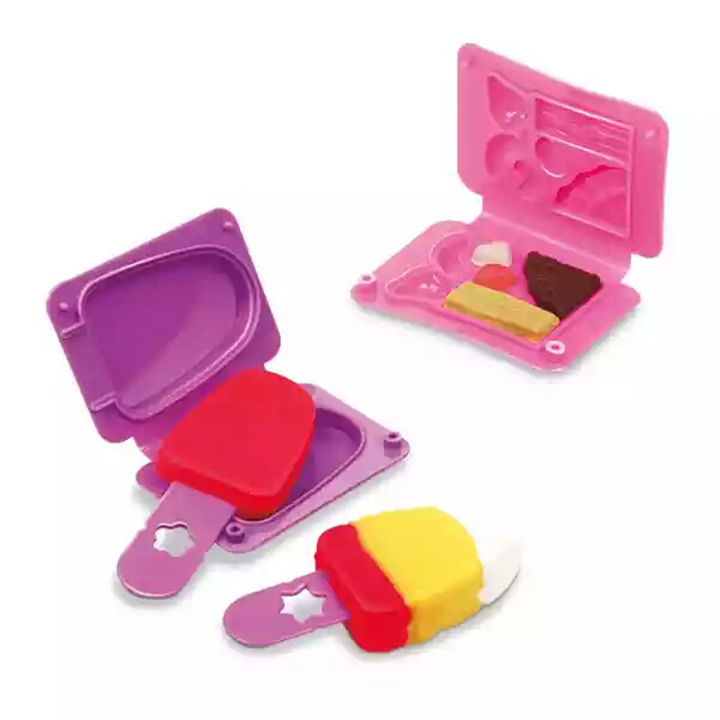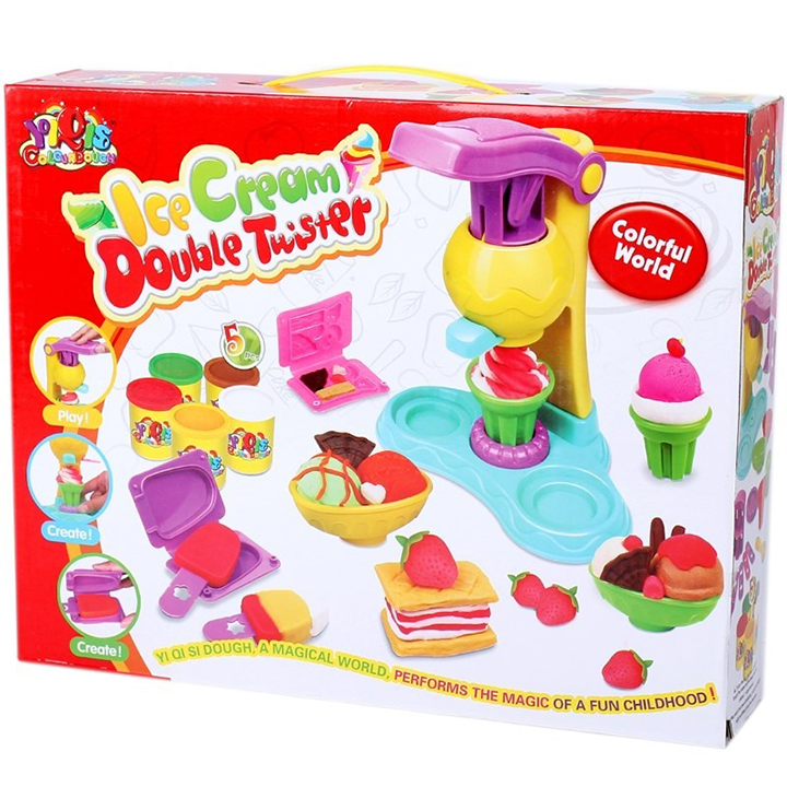 Với những hộp bột nặn nhiều màu sắc đi kèm bé có thể tạo nên những cốc kem và những que kem thật nhiều màu sắc với những hương vị khác nhau như: