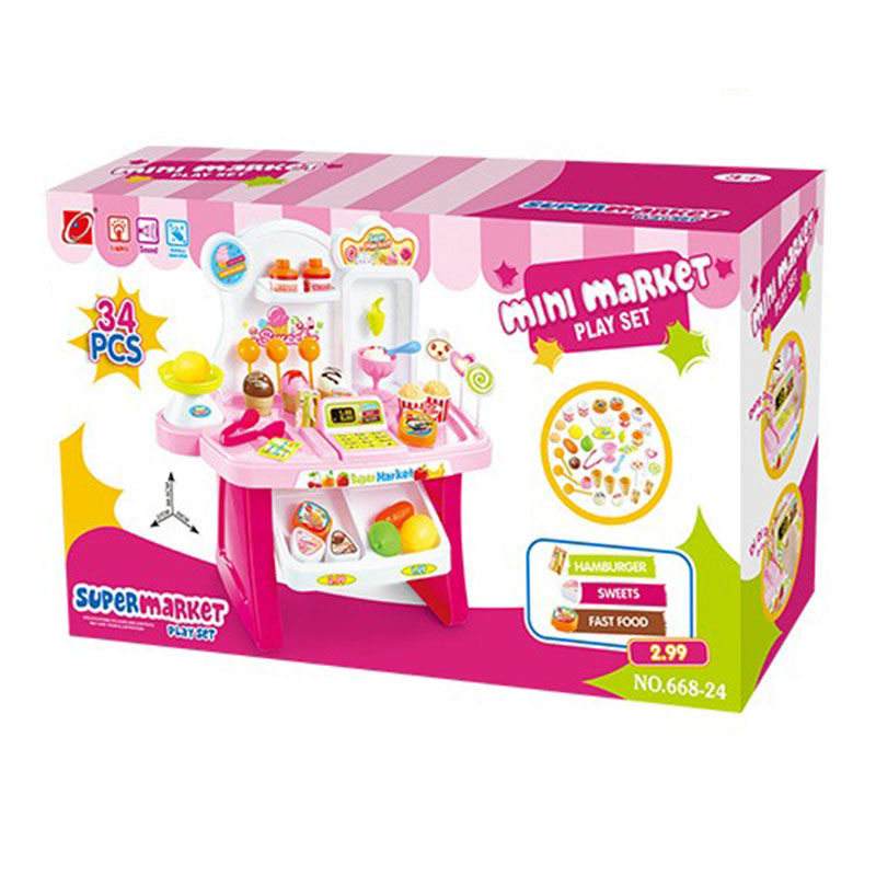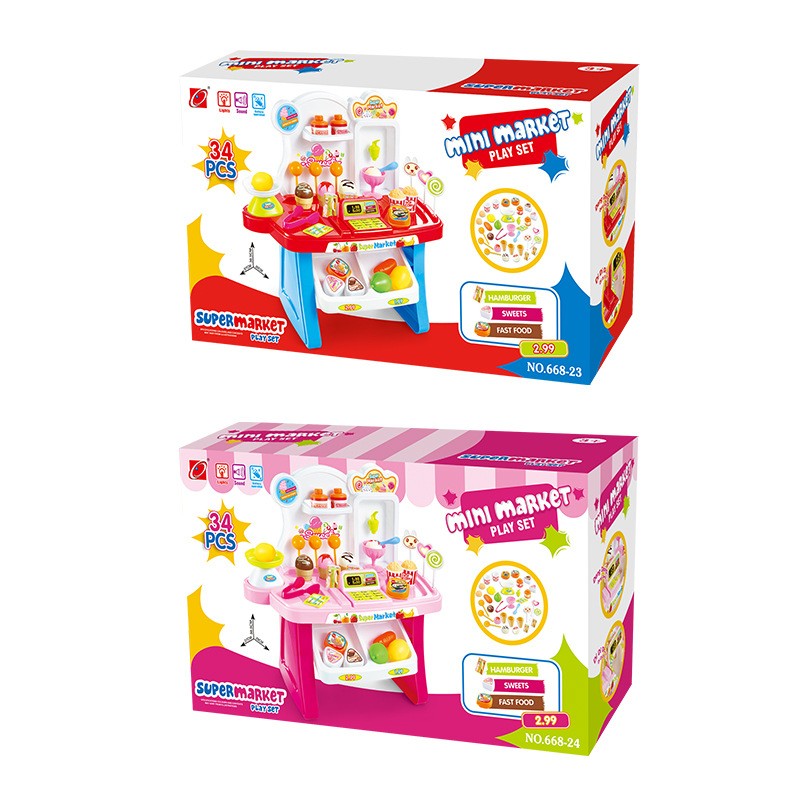 BỘ ĐỒ CHƠI SIÊU THỊ MINI MARKET là bộ đồ chơi mô phỏng sinh động một quầy bán hàng của siêu thị với nhiều đồ dùng đẹp mắt, thu hút các bé gái chơi say mê hàng giờ với bộ đồ chơi đồ hàng này. Bộ sản phẩm bao gồm 34 chi tiết phong phú, kích thích trí tưởng tượng và giúp bé có trải nghiệm như thật tại gian hàng siêu thị mini: quầy tính tiền, cân thực phẩm, máy nhận thẻ tín dụng, củ quả, kẹo bánh..