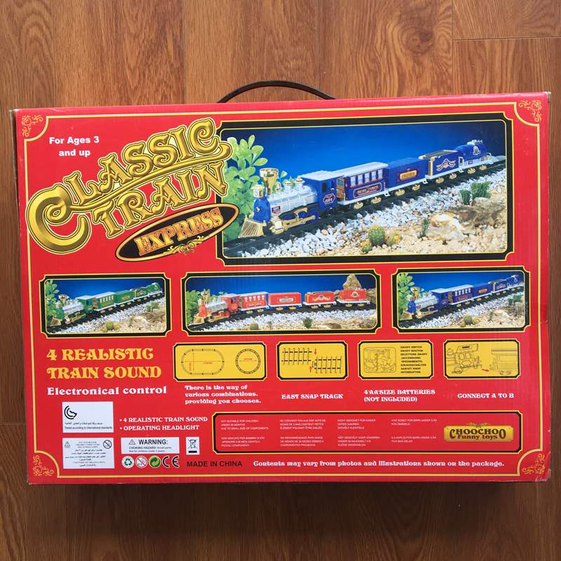 – Bao gồm đầu tàu chạy pin và 1 toa xe chở chất lỏng, 1 toa xe chở hàng, 3 toa nối vào nhau dài khoảng 40 cm, và 12 thanh ray để có thể nối vào nhau tạo thành đường tròn