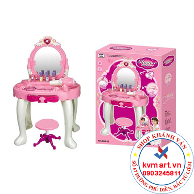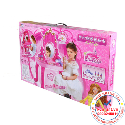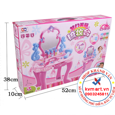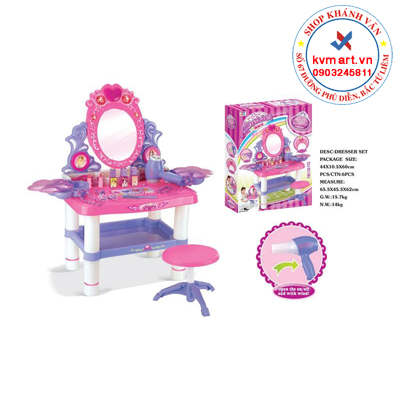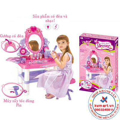 - Bộ bàn ghế trang điểm cho bé gái bao gồm đầy đủ các loại vật dụng như: Bàn ghế và gương trang điểm, lược chải đầu, máy sấy tóc, bộ đồ mĩ phẩm đầy đủ son phấn, đồ trang sức.. mang lại cho bé 1 không gian dành riêng cho mình, bé có thể thỏa sức sáng tạo và làm đẹp với các vật dụng nhỏ xinh này.