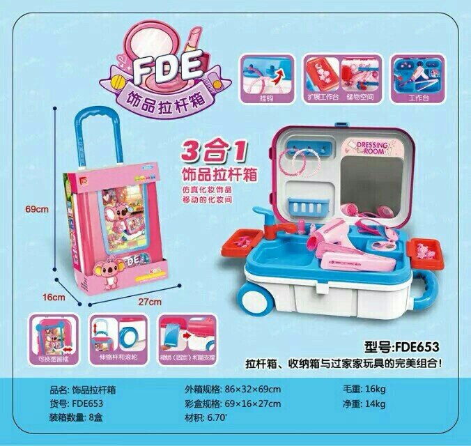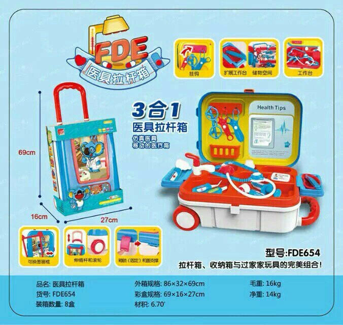 - Bộ vali bác sỹ mô phỏng lại hầu hết những vật dụng bác sĩ dùng để khám bệnh cho bệnh nhân. Bao gồm đầy đủ các dụng cụ và phụ kiện đi kèm rất sinh động như: Hộp đựng dụng cụ, ống nghe xinh xắn, urgo, bông thấm, kim tiêm nhựa...