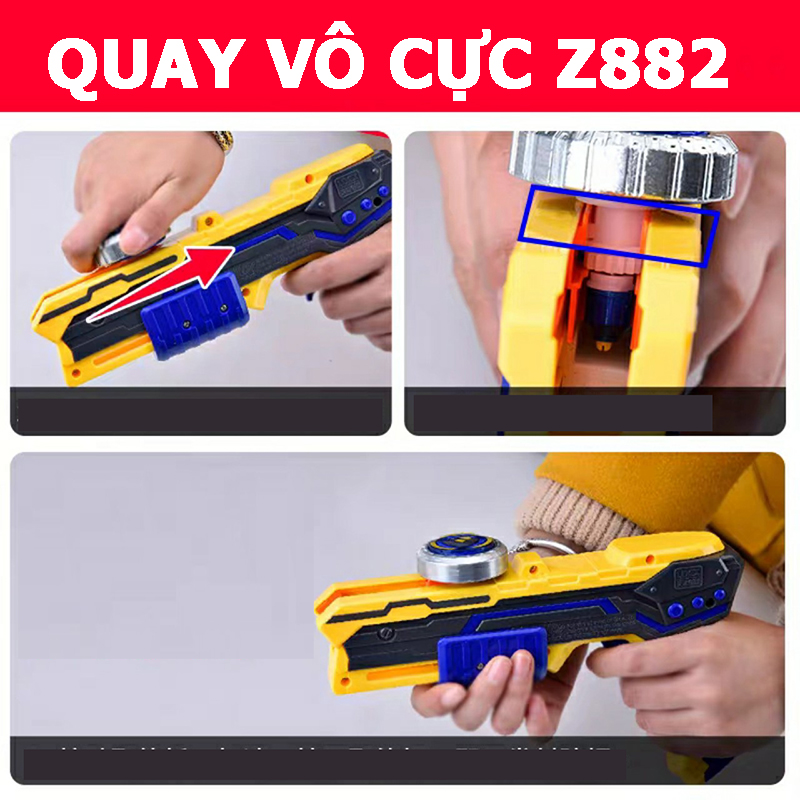 Sản phẩm gồm 1 thiét bị phóng quay, 1 con quay và 1 dụng cụ để tháo rời các chi tiết con quay. Con quay rất khỏe dễ quay. Lắp con quay tự dính vào tay quay không phải chỉnh góc rất dễ vào, Khi quay đến mức cực đại bé ấn nhẹ thanh gạt bên hông là con quay tự rơi ra