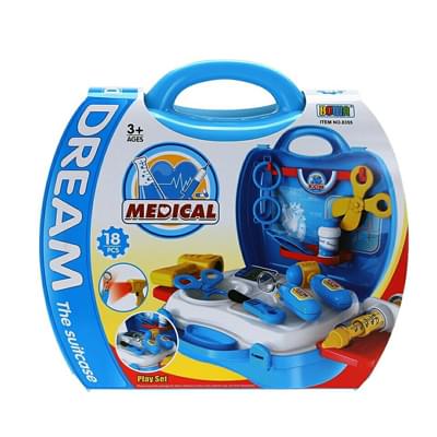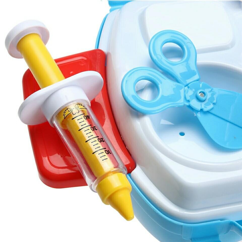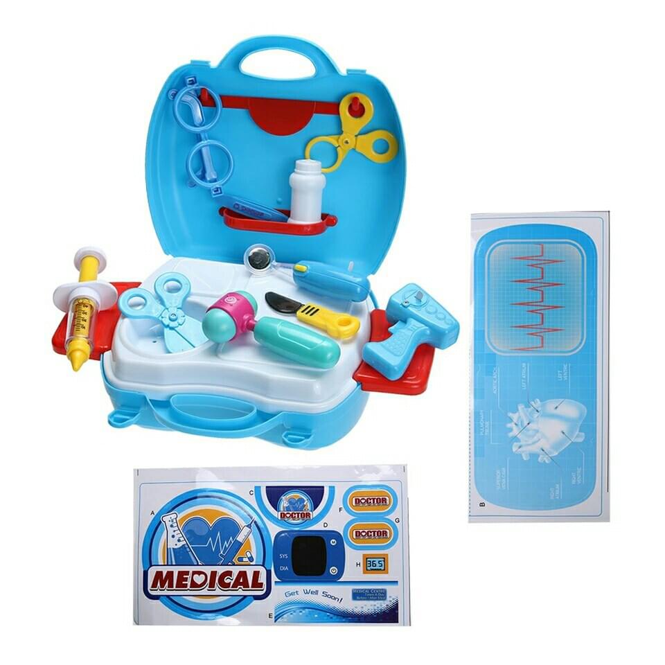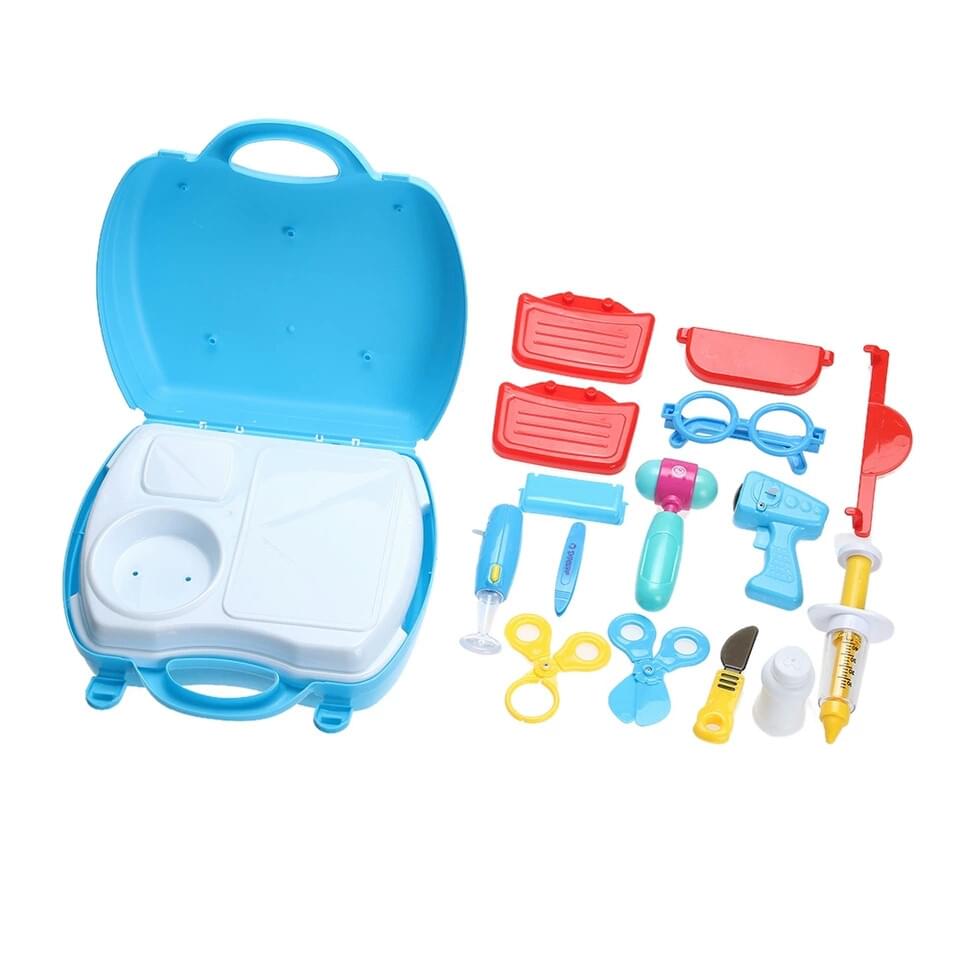 - Bộ vali bác sỹ mô phỏng lại hầu hết những vật dụng bác sĩ dùng để khám bệnh cho bệnh nhân. Bao gồm đầy đủ các dụng cụ và phụ kiện đi kèm rất sinh động như: Hộp đựng dụng cụ, ống nghe xinh xắn, urgo, bông thấm, kim tiêm nhựa...