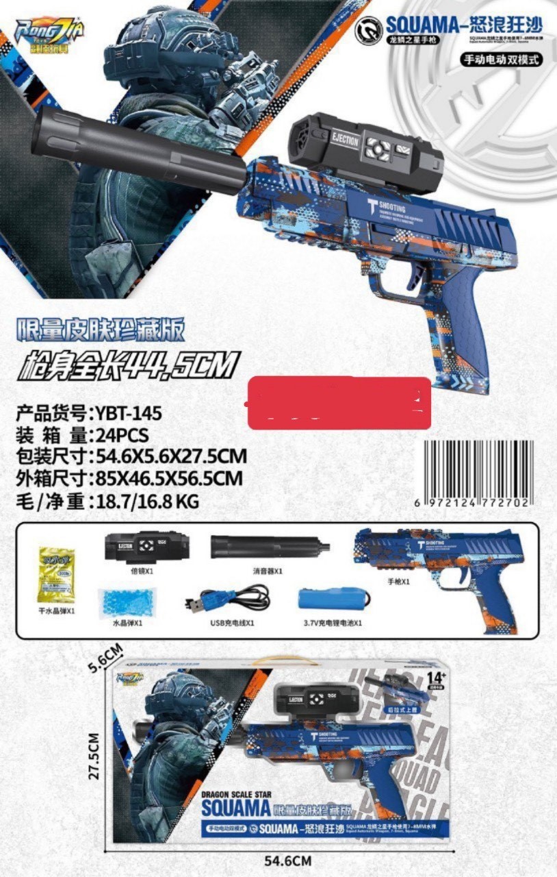 Đồ chơi bắn đạn thạch liên thanh - YBT145 hay còn gọi là gel gun là cách gọi chung của các mẫu mô hình bắt trước các mẫu trong thực tế. Gelgun sử dụng loại đạn thạch 7-8mm, dạng viên hình tròn như silicon. Loại viên thạch này ban đầu ở trạng thái khô, sau khi ngâm với nước sẽ nở ra..
