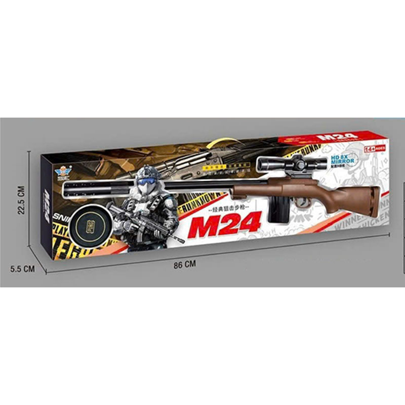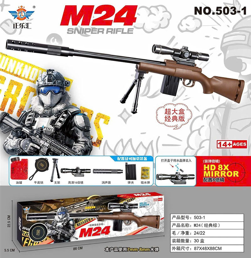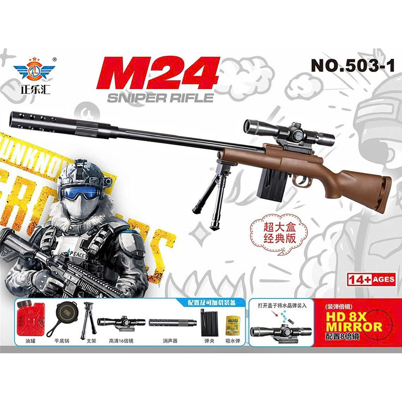 Đồ chơi M24 phóng hạt nở - 5031 là mẫu mô hình làm theo các mẫu trong thực tế. Đồ chơi sử dụng loại hạt nở 7-8 mm, dạng viên hình tròn như silicon. Loại viên thạch này ban đầu ở trạng thái khô, sau khi ngâm với nước sẽ nở ra