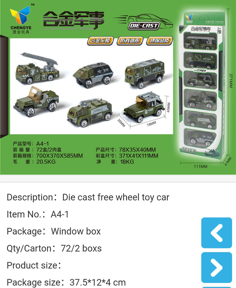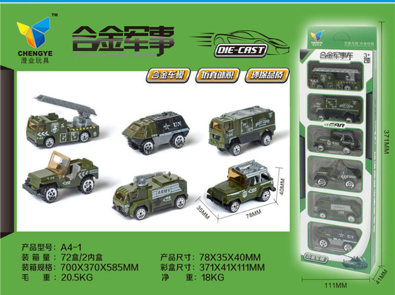 Đồ chơi mô hình 6 xe oto Quân sự làm bằng sắt - A41 là loại đồ chơi mô phỏng nguyên mẫu những chiếc otô quân sự của Mỹ theo tỷ lệ 1:32 của những chiếc xe này ngoài thực tế. Đây là sản phẩm của hãng CHENGYE sản xuất và ra mắt năm 2019 xe được làm từ kim loại kết hợp với các chất liệu nhựa an toàn, không gây hại cho sức khỏe của bé. Thiết kế đẹp mắt với 6 mẫu để bé nhà bạn lựa chọn, đây là loại ô tô mô hình sắt, rất bền không độc hại, bé có thể chơi vài năm, thậm chí là theo bé đến tận khi lớn.