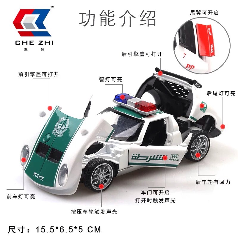 Đồ chơi mô hình xe cảnh sát làm bằng sắt - CZ103J là loại đồ chơi mô phỏng nguyên mẫu chiếc otô cảnh sát dubai sửa dụng trong công việc tuần tra hàng ngày và được thu nhỏ theo tỷ lệ 1:32 của chiếc xe cứu hỏa ngoài thực tế, xe được làm từ chất liệu an toàn, không gây hại cho sức khỏe của bé. Đây là sản phẩm của hãng CHE ZHI sản xuất và ra mắtnăm 2019 Thiết kế đẹp mắt với 2 mẫu để bé nhà bạn lựa chọn, đây là loại ô tô mô hình sắt, rất bền không độc hại, bé có thể chơi vài năm, thậm chí là theo bé đến tận khi lớn.