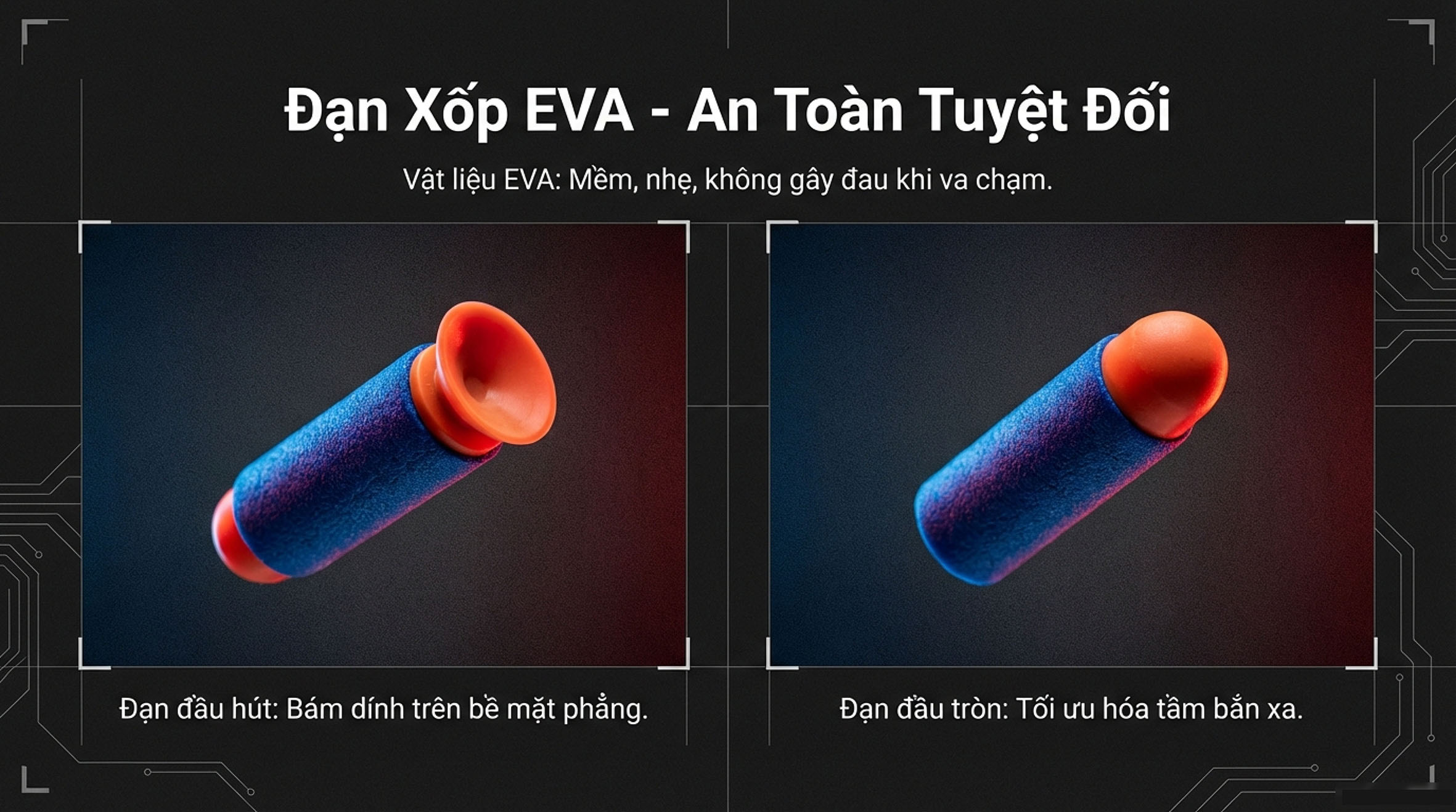 Sản phẩm được làm từ chất liệu nhựa nguyên sinh ABS cao cấp, đảm bảo an toàn trong quá trình sử dụng. Đạn xốp được thiết kế mềm mại, có đầu hút chân không, giúp nâng cao trải nghiệm khi sử dụng mà vẫn duy trì mức độ an toàn tối đa.