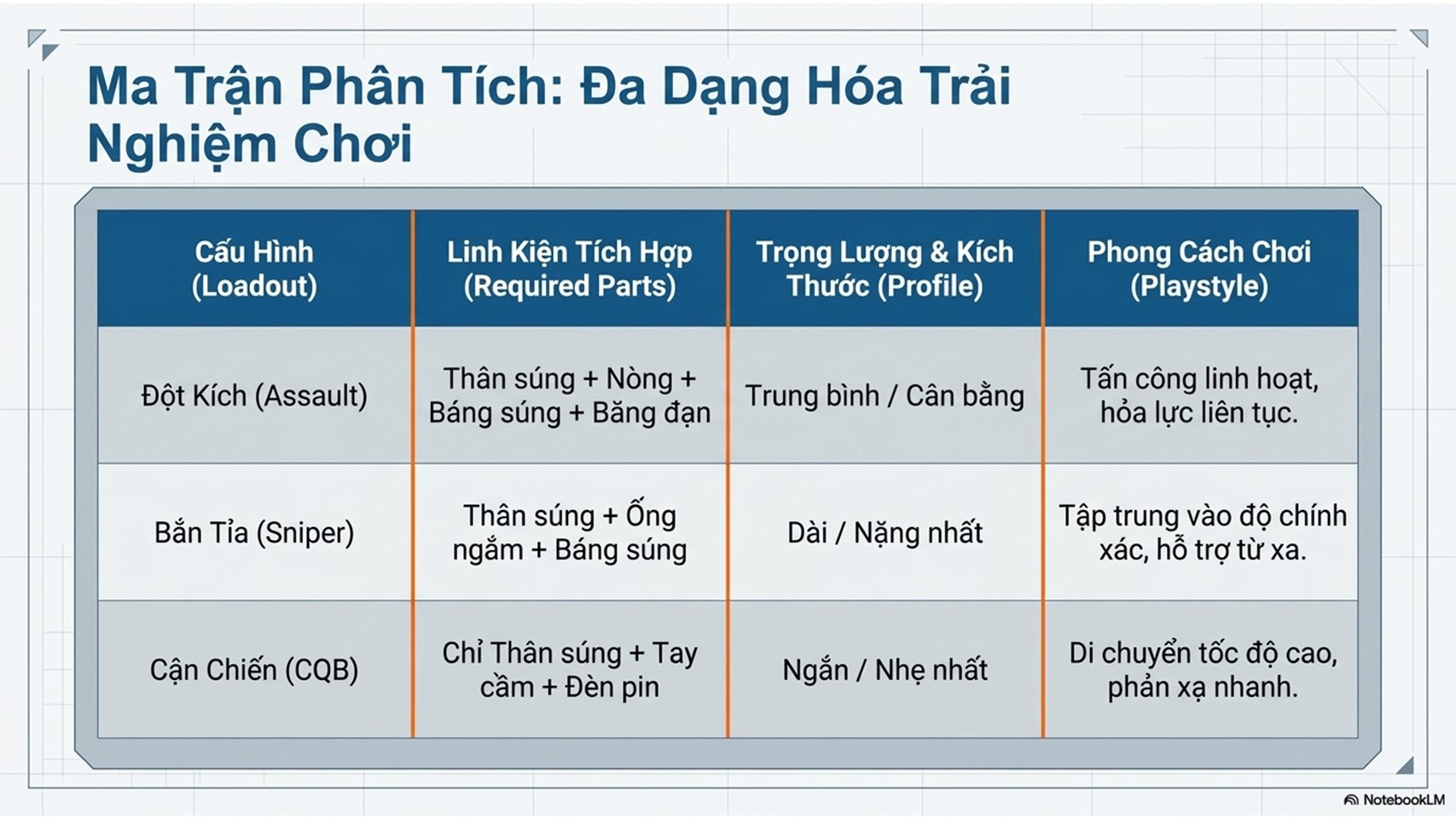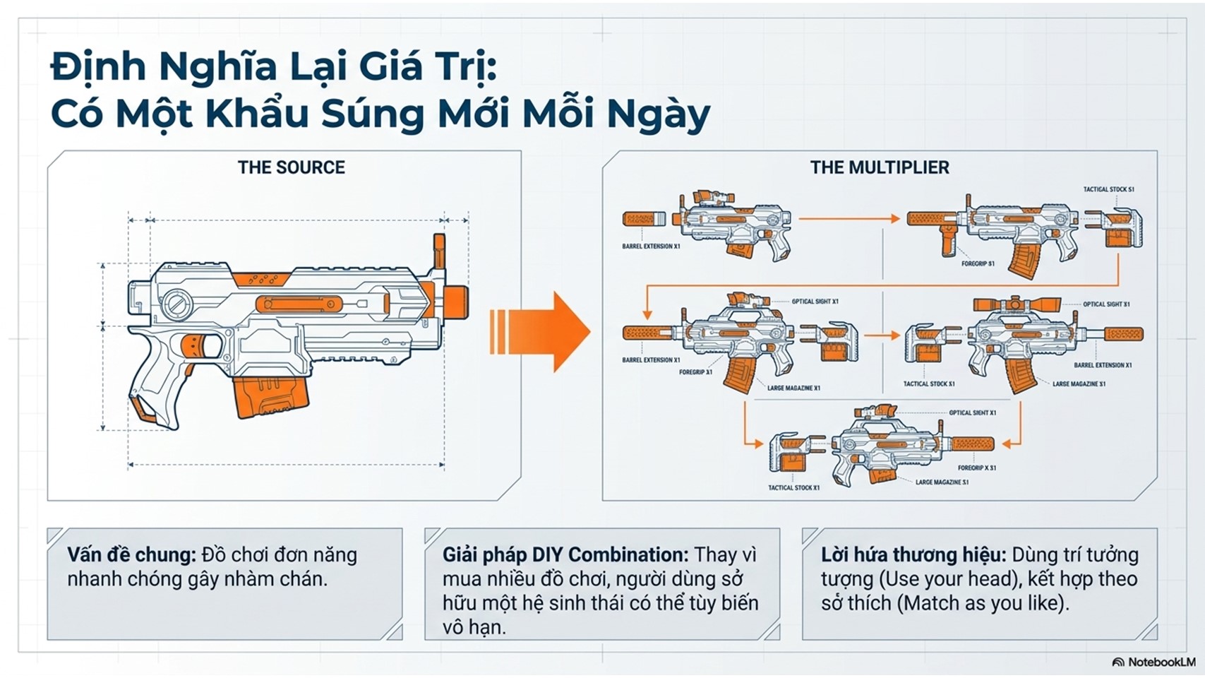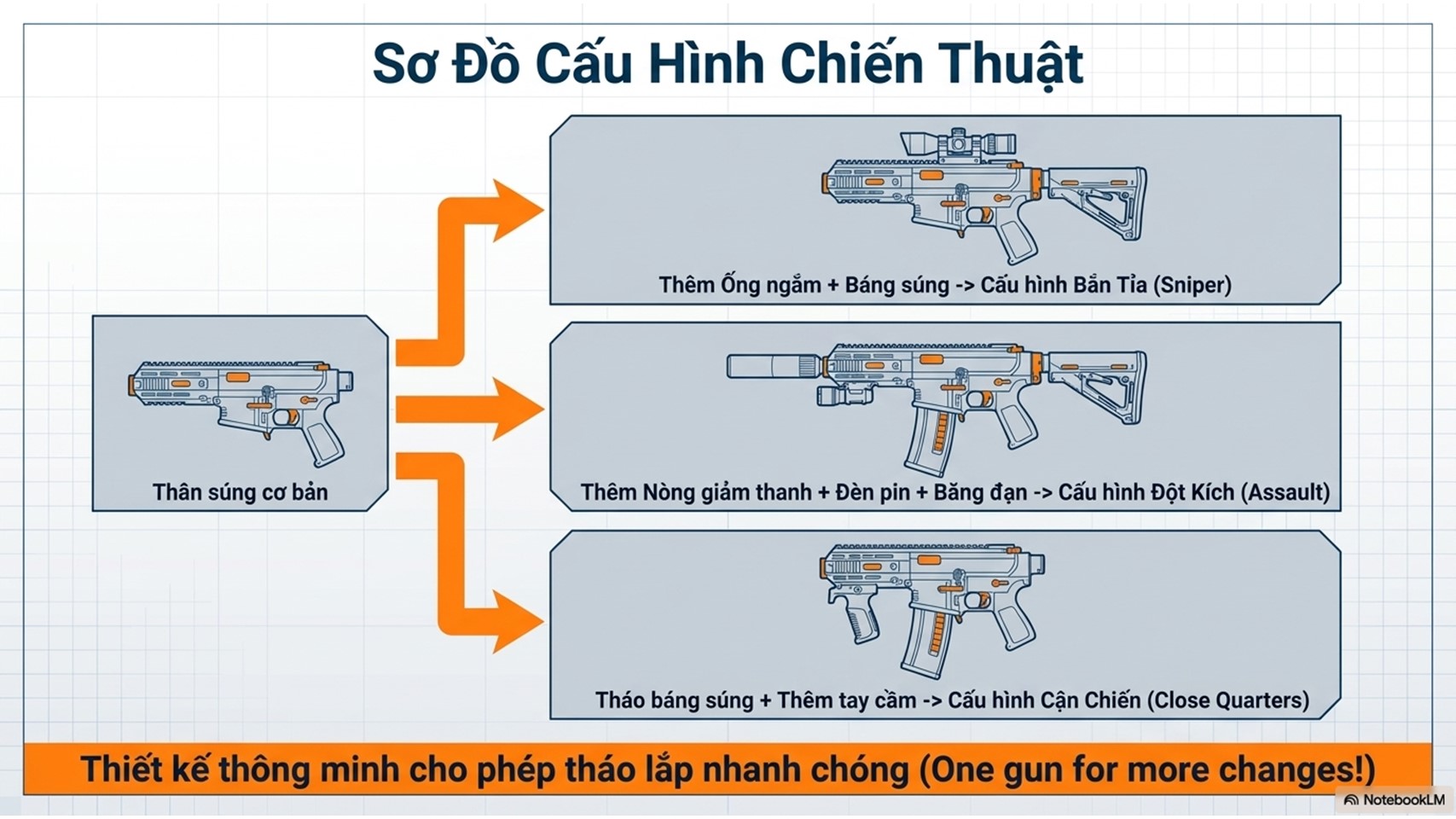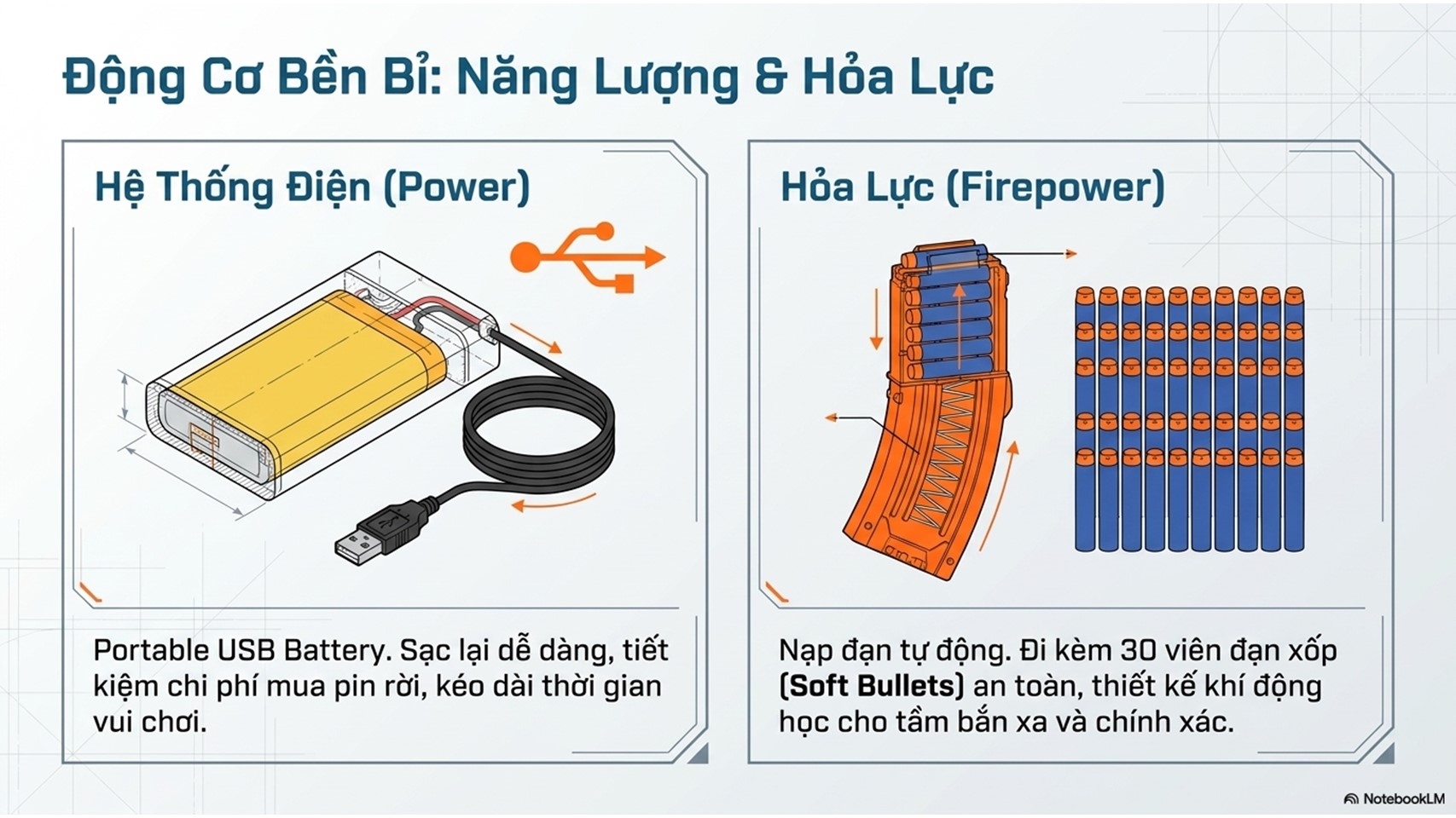 - Phụ kiện chính: Thân chính, ống giảm âm, báng cầm, ống ngắm, đèn pin, băng chứa, 30 viên thanh xốp mềm, pin sạc và cáp USB.