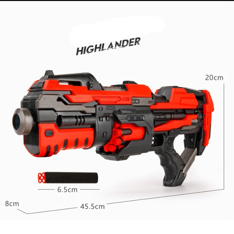 Đặc điểm: súng bắn đạn xốp an toàn sử dụng 3 pin AA. Sau khi gắn đạn vào khay đạn, sau mỗi lần bóp cò các đạn mút xốp sẽ tự động bắn ra.