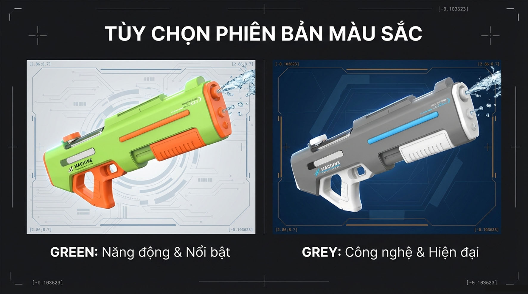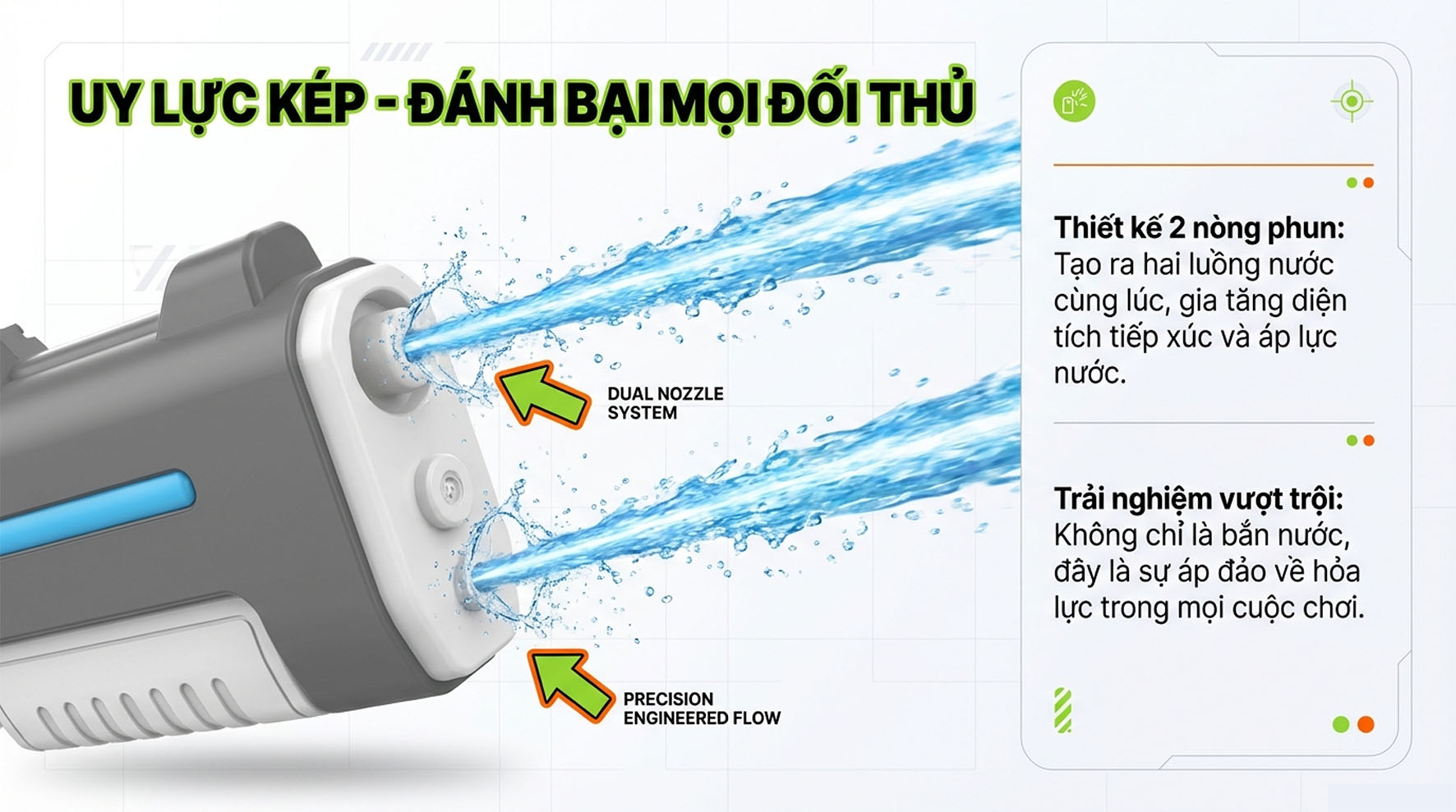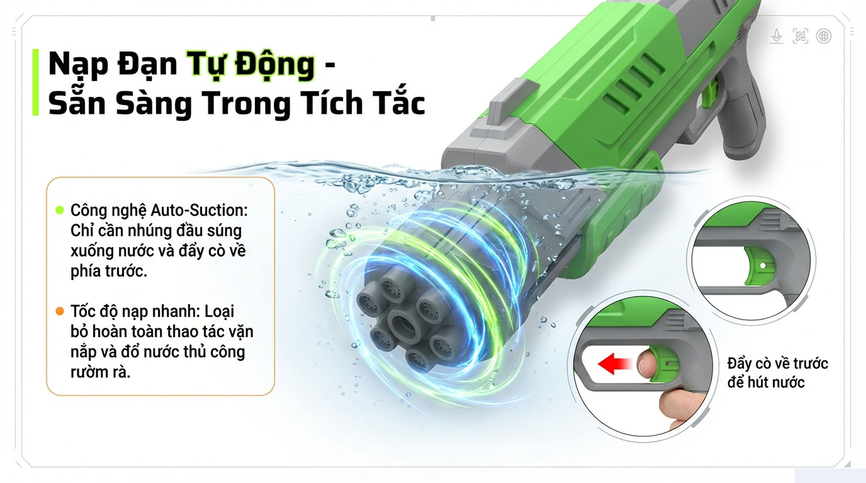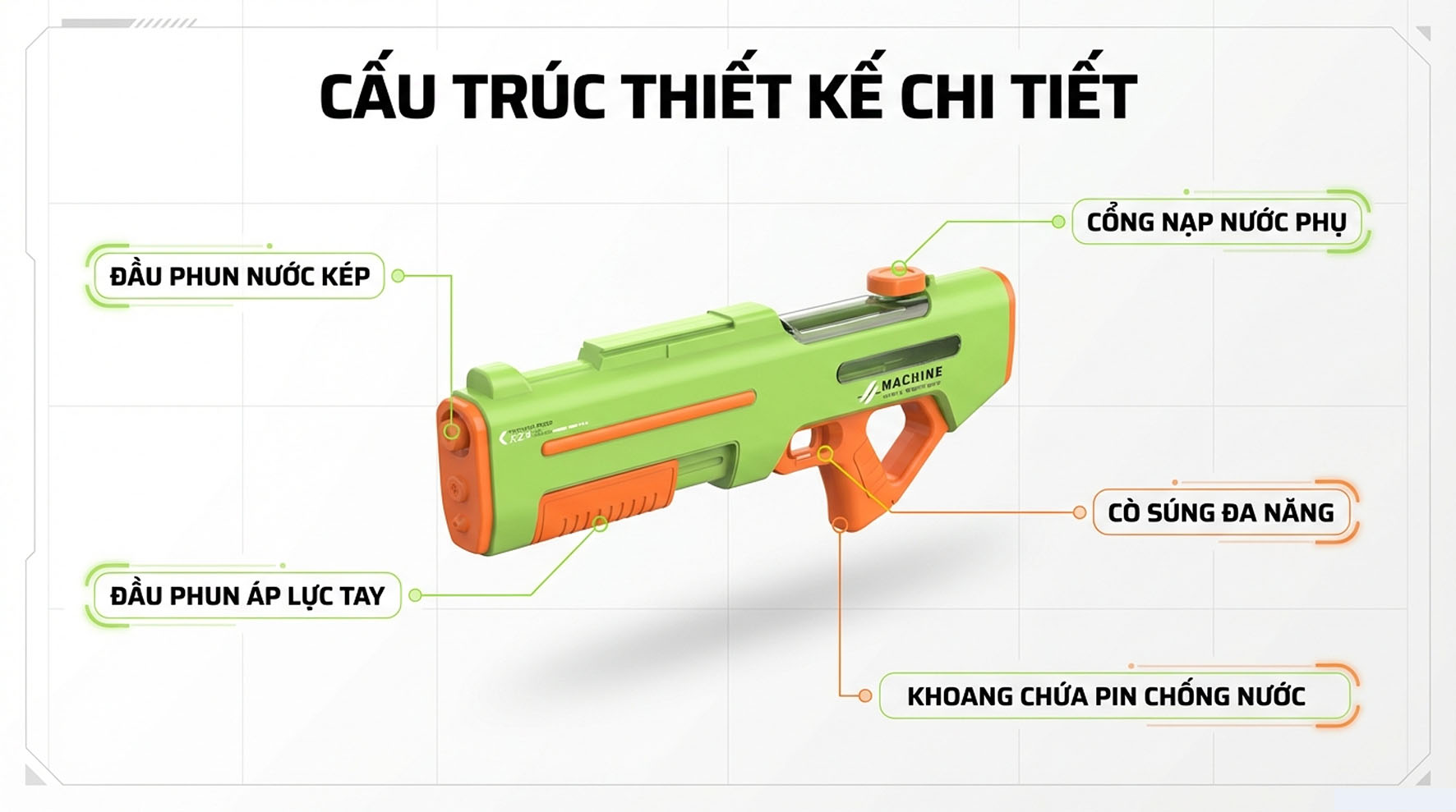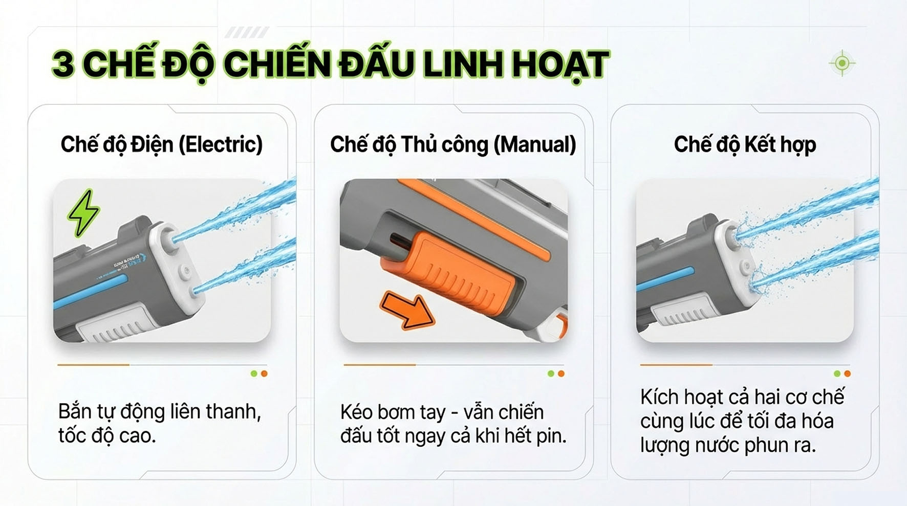 4 – Súng nước có 2 lớp chống thấm có thể tiếp xúc với nước trong thời gian ngắn. Vui lòng không ngâm trong nước trong thời gian dài. Tránh làm hỏng các linh kiện điện tử.