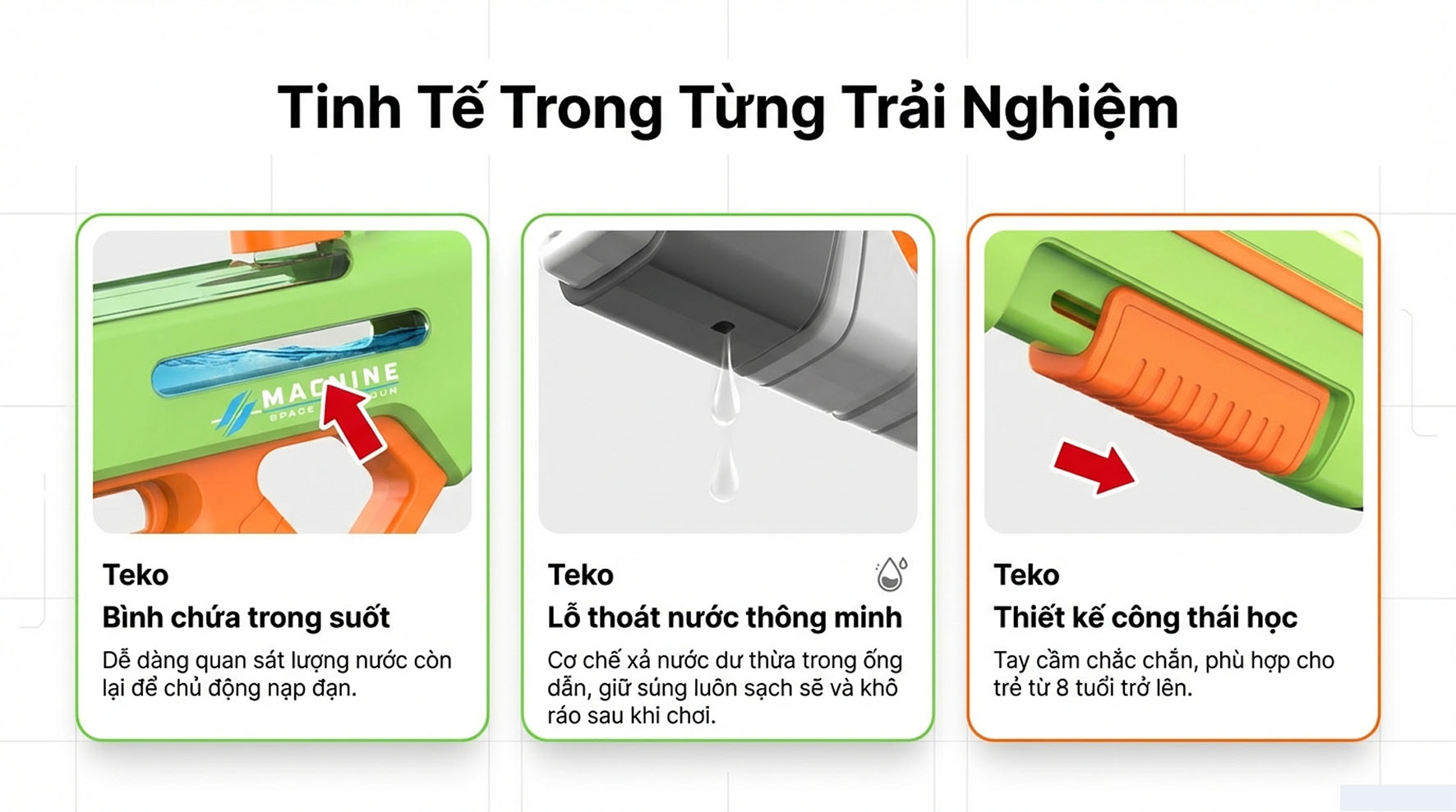 1 – Mỗi súng nước đều được kiểm tra trước khi xuất xưởng để đảm bảo chất lượng sản phẩm. Do đó, có thể còn sót lại giọt nước trong súng nước, nhưng mỗi sản phẩm của chúng tôi đều là sản phẩm mới.