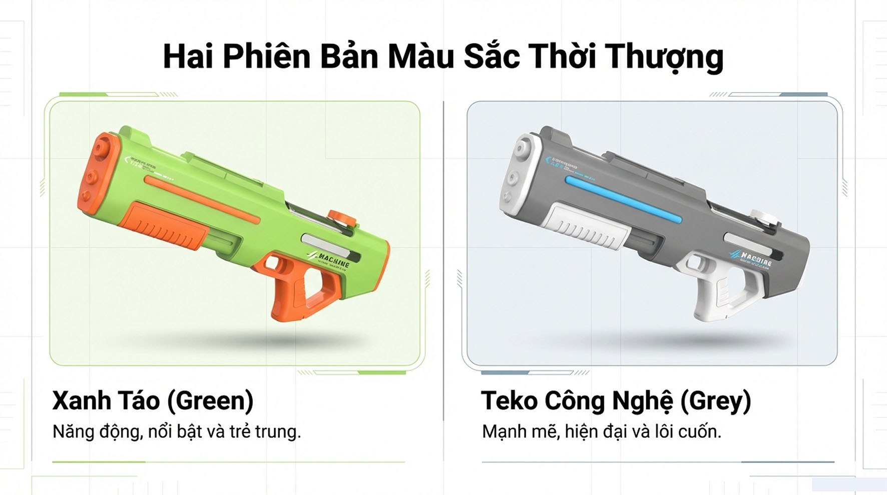 - Súng phun nước điện: sản phẩm nước này chạy bằng pin và có thể bắn liên tục chỉ bằng một cú nhấn nhẹ vào cò súng, giúp bạn tiết kiệm năng lượng khi chơi. Nó phù hợp cho trẻ em từ 7 đến 10 tuổi và người lớn và là đồ chơi hoàn hảo cho khu vườn mùa hè, hồ bơi và bãi biển.