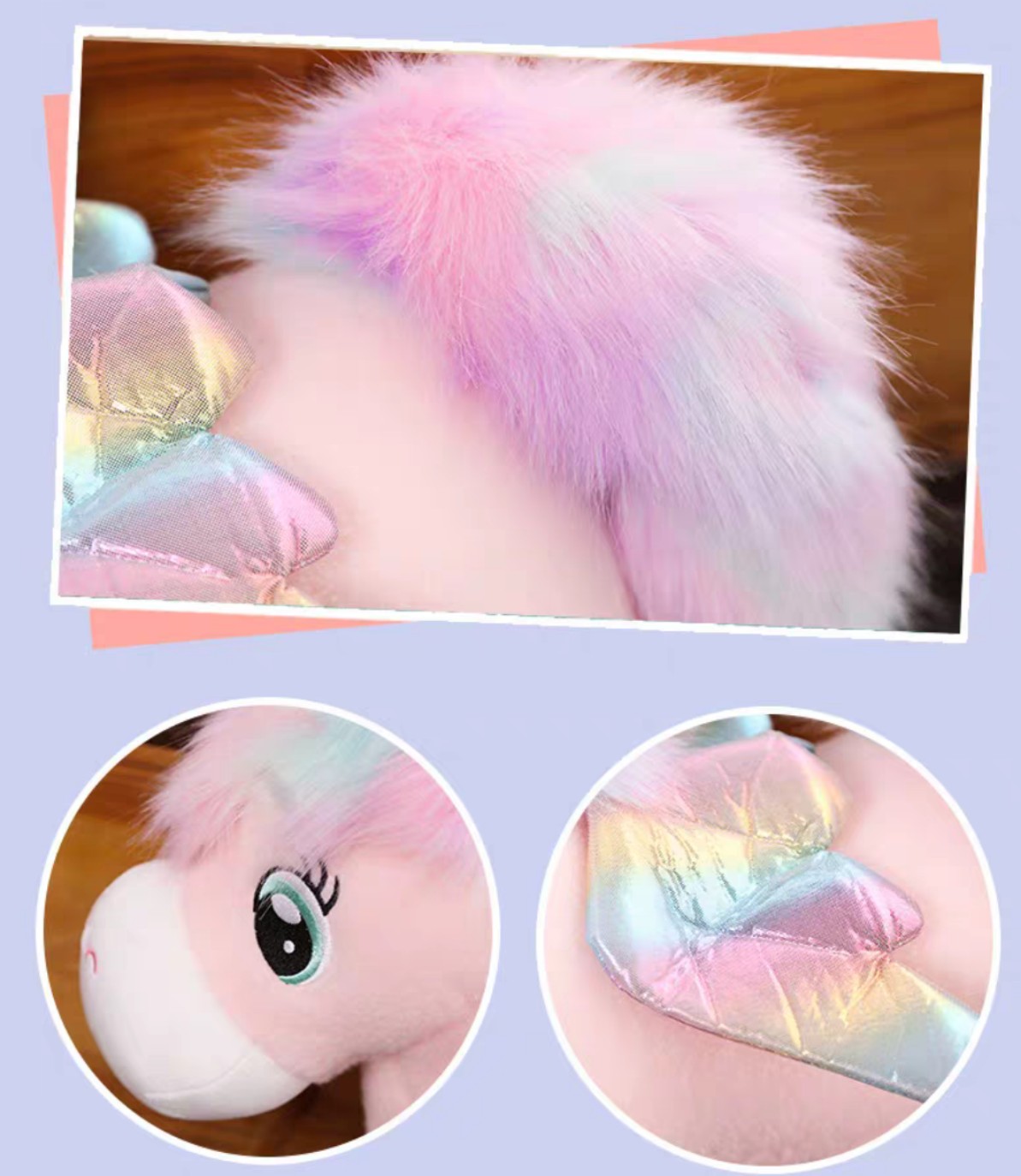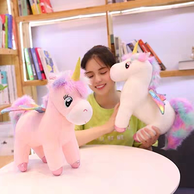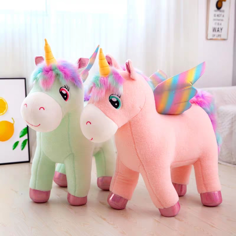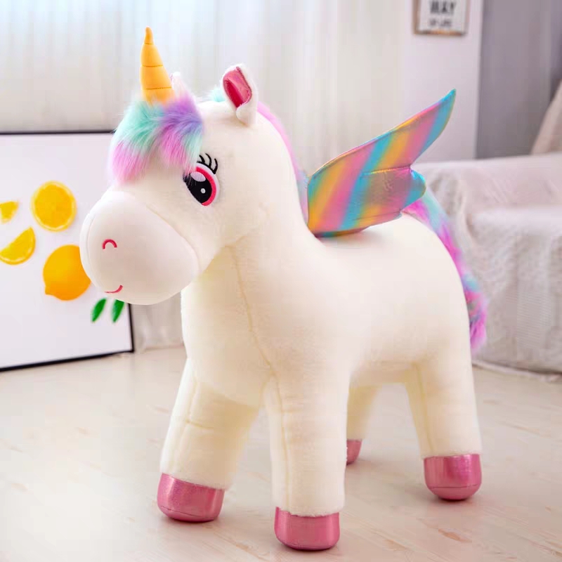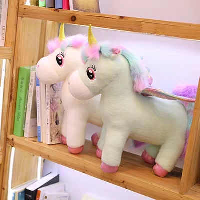 Kỳ lân nhồi bông được trang trí đôi cánh, bờm và đuôi có nhiều mầu sắc