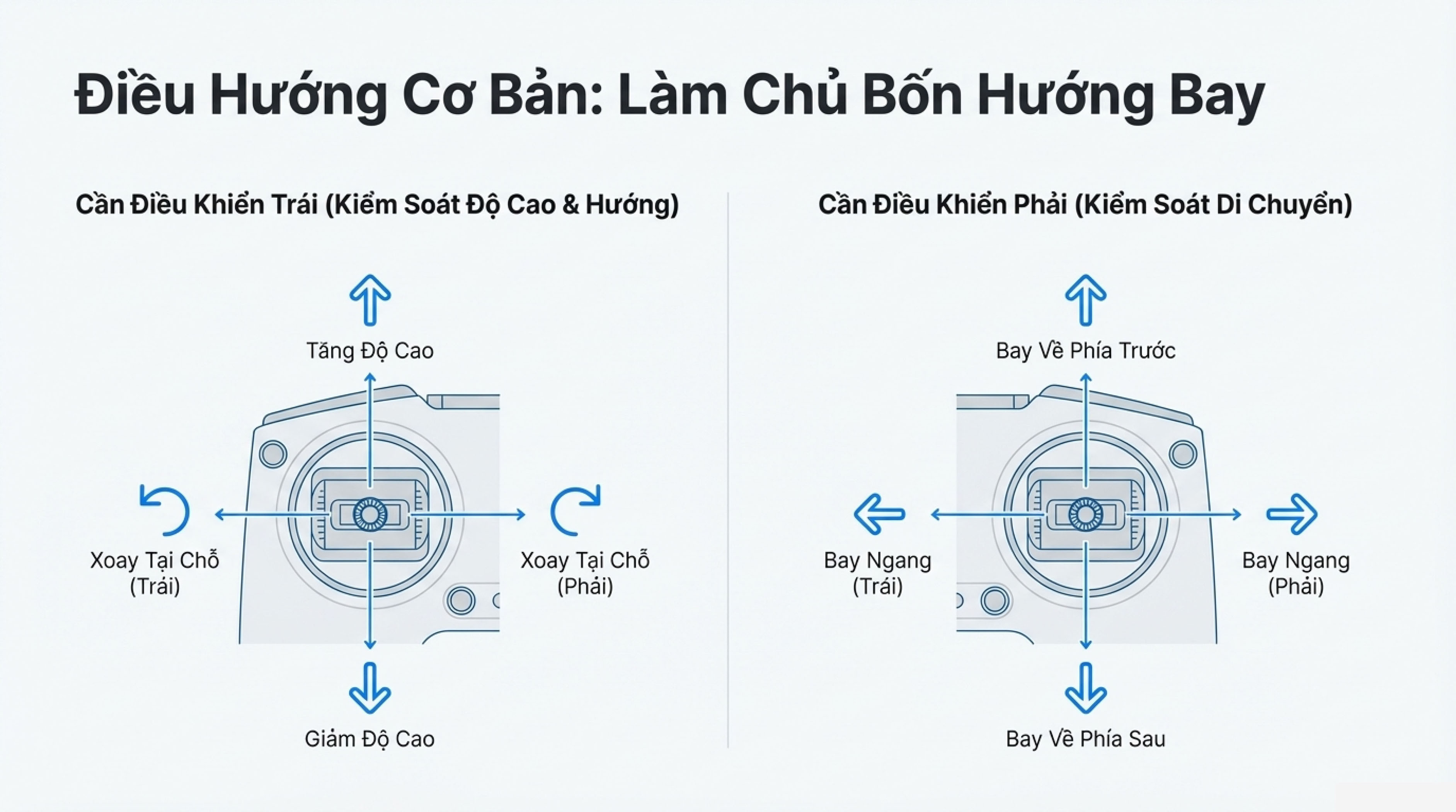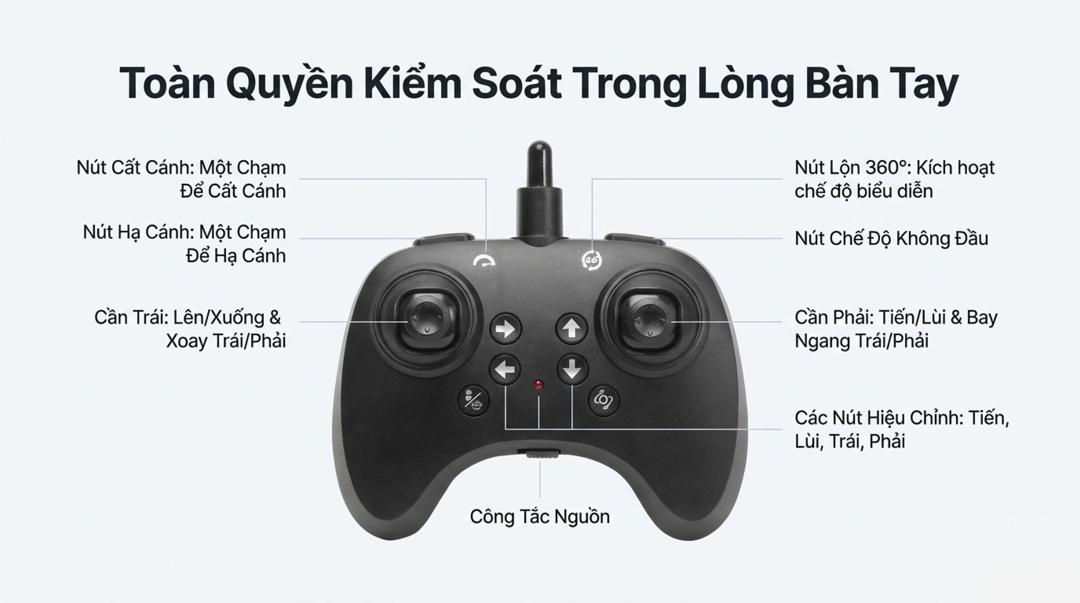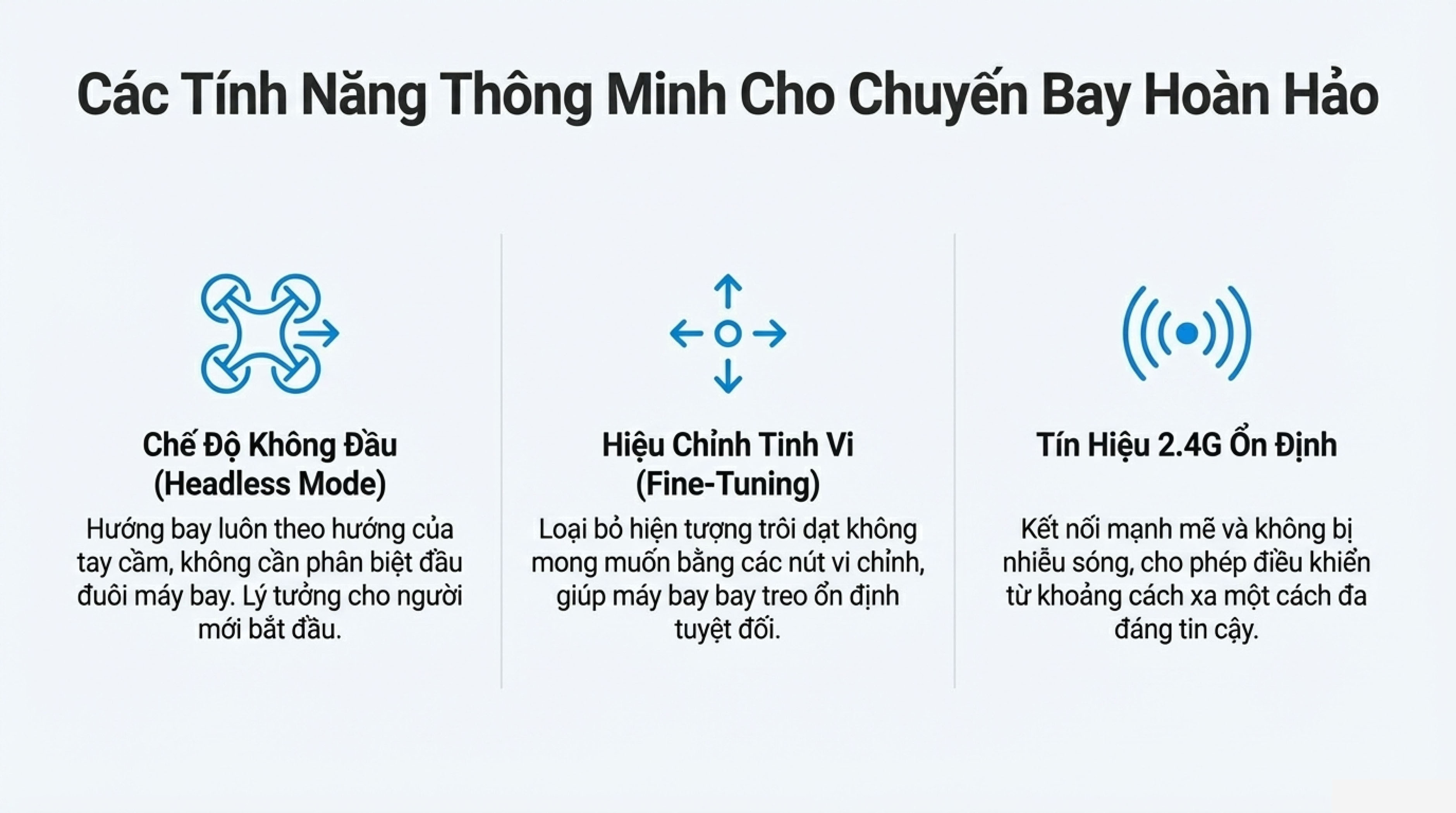 Chế độ không đầu (Headless Mode): Giúp người mới dễ dàng định hướng mà không cần phân biệt đầu-đuôi máy bay.