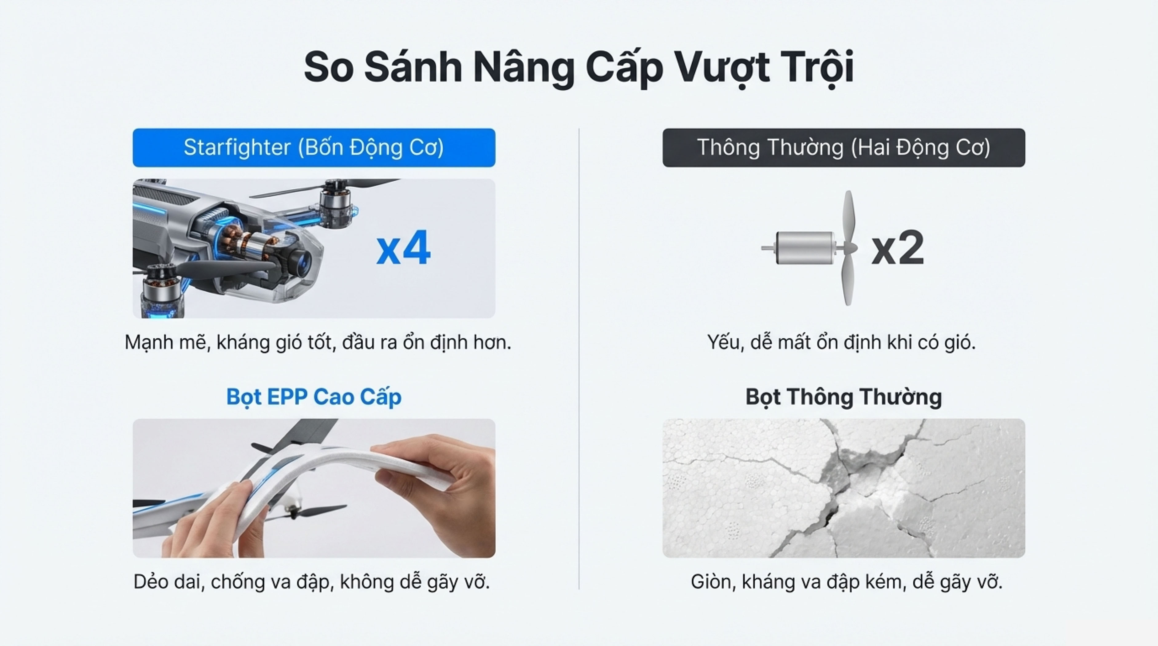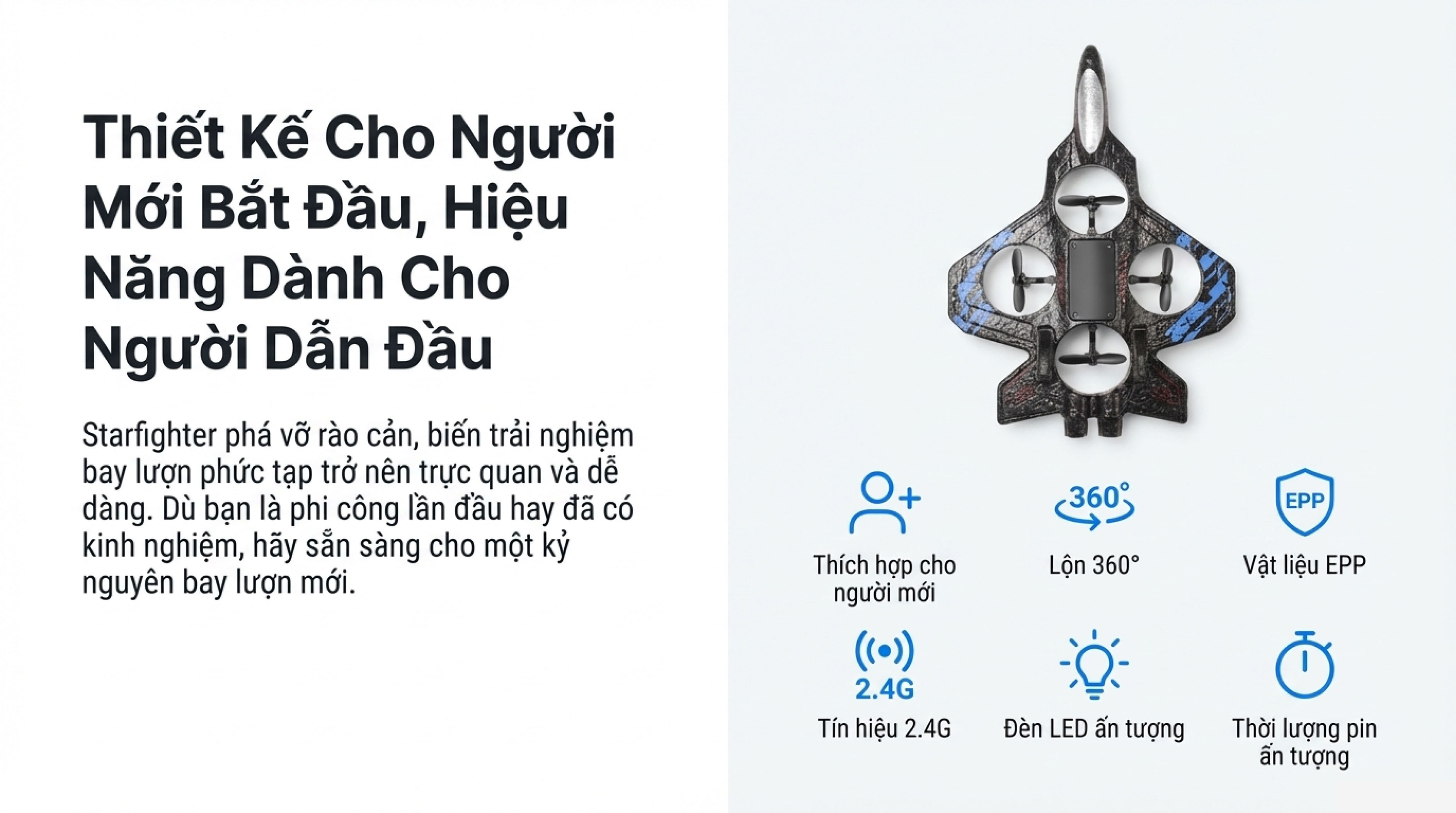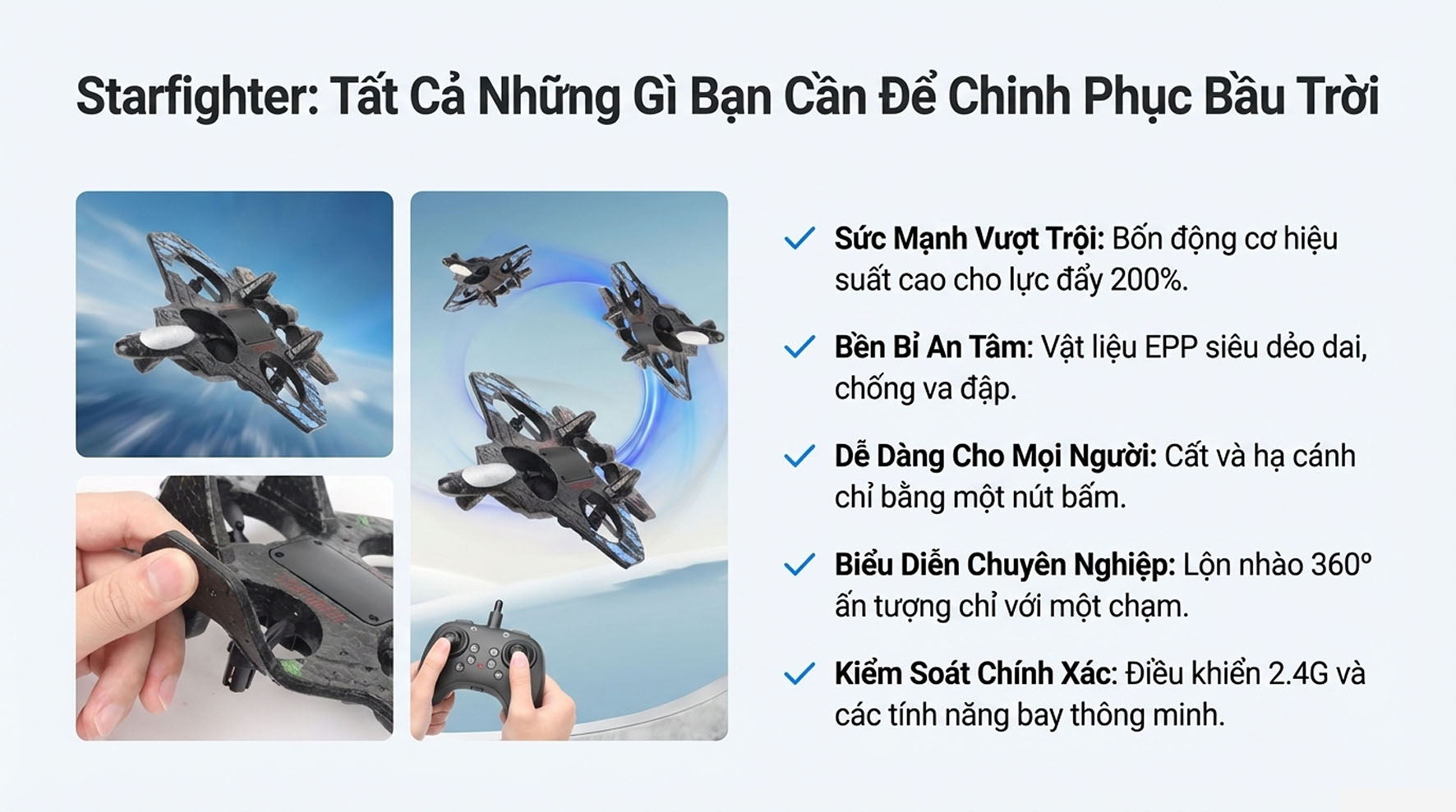 Kết luận: Với sự kết hợp hoàn hảo giữa vật liệu siêu bền, động cơ mạnh mẽ và hệ thống điều khiển thông minh, Starfighter không chỉ là một món đồ chơi mà là người bạn đồng hành lý tưởng để bạn khám phá không trung.