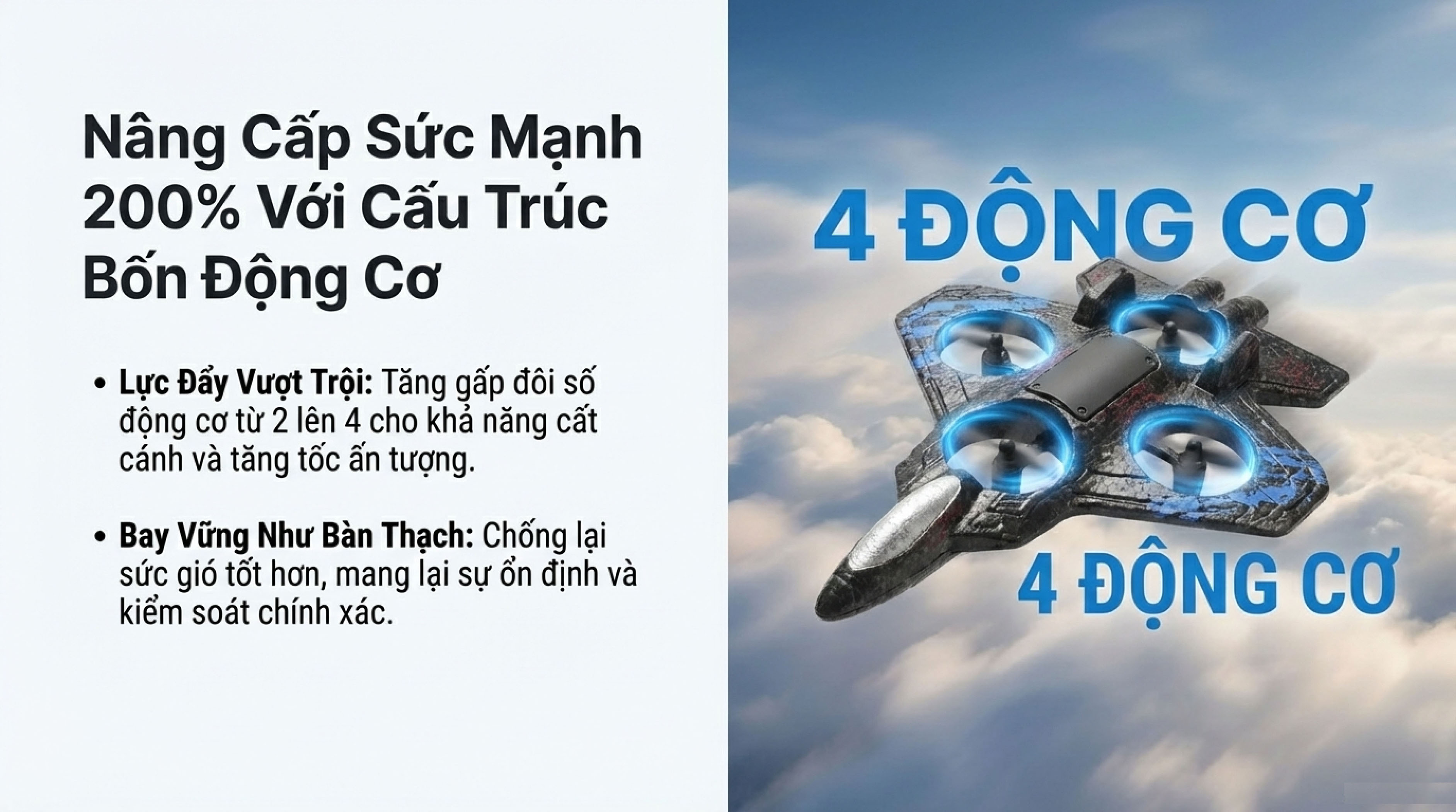 Lực đẩy mạnh mẽ: Tăng gấp đôi số lượng động cơ giúp máy bay cất cánh và tăng tốc cực kỳ ấn tượng.