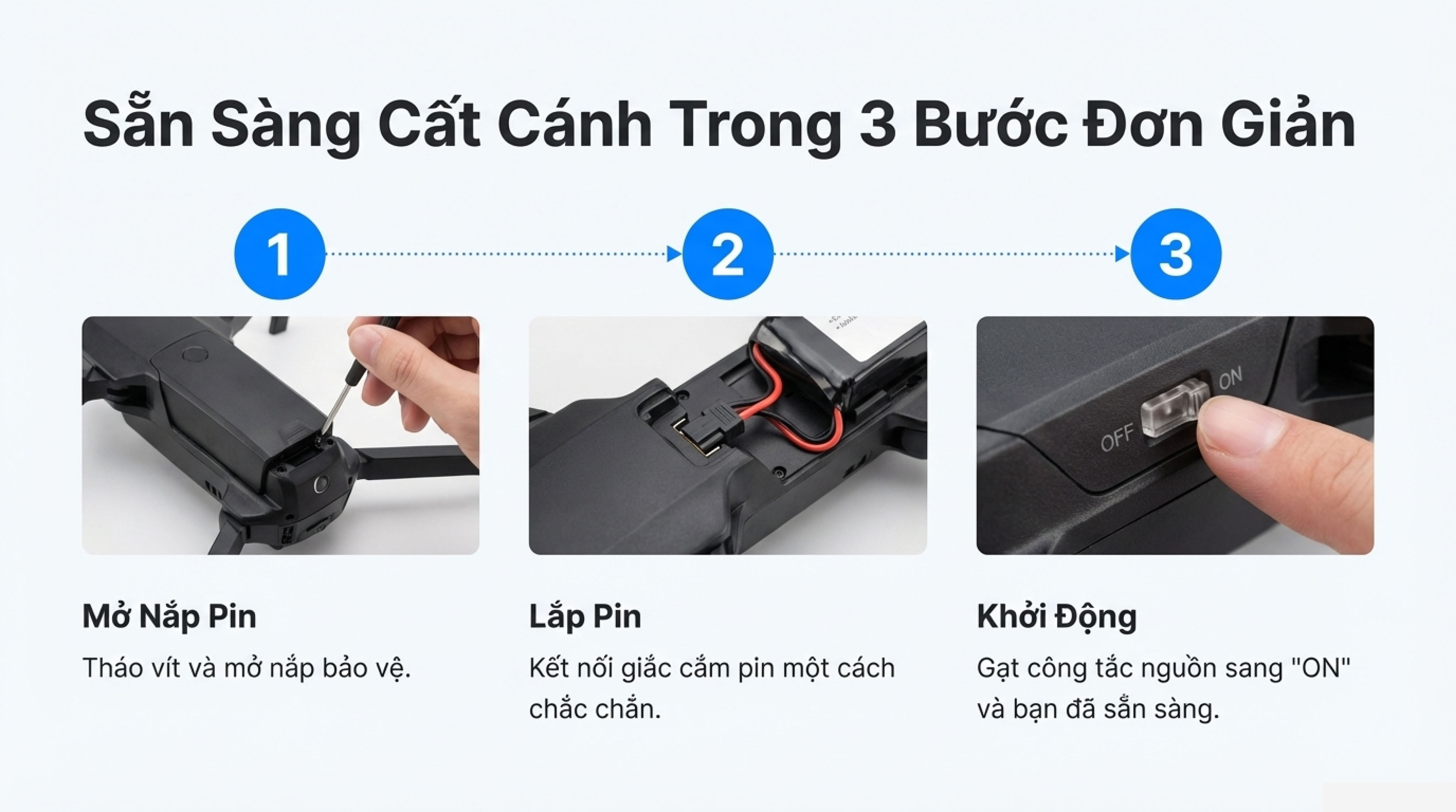Kết nối năng lượng: Lắp pin vào khay chứa và kết nối giắc cắm chắc chắn.
