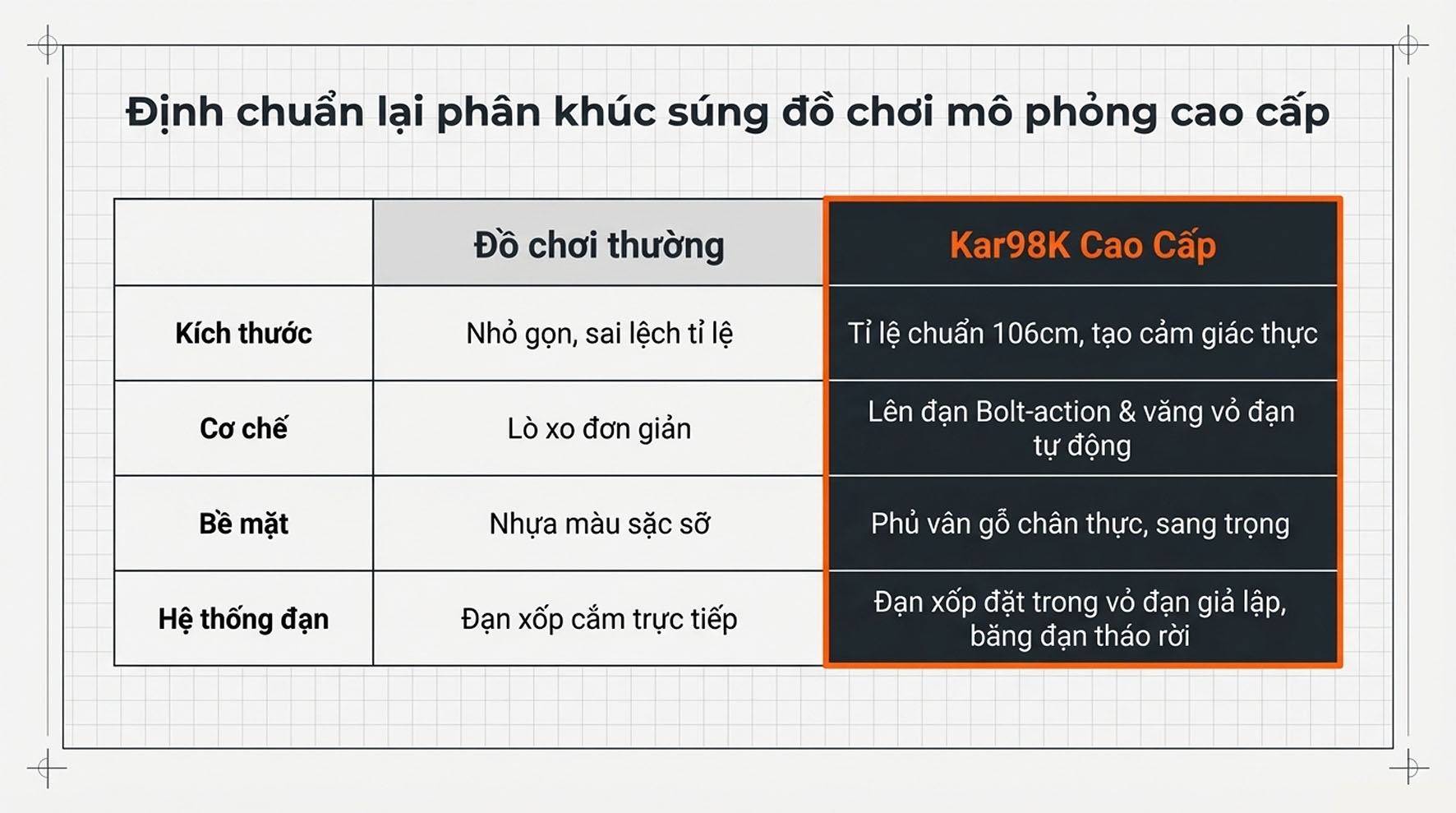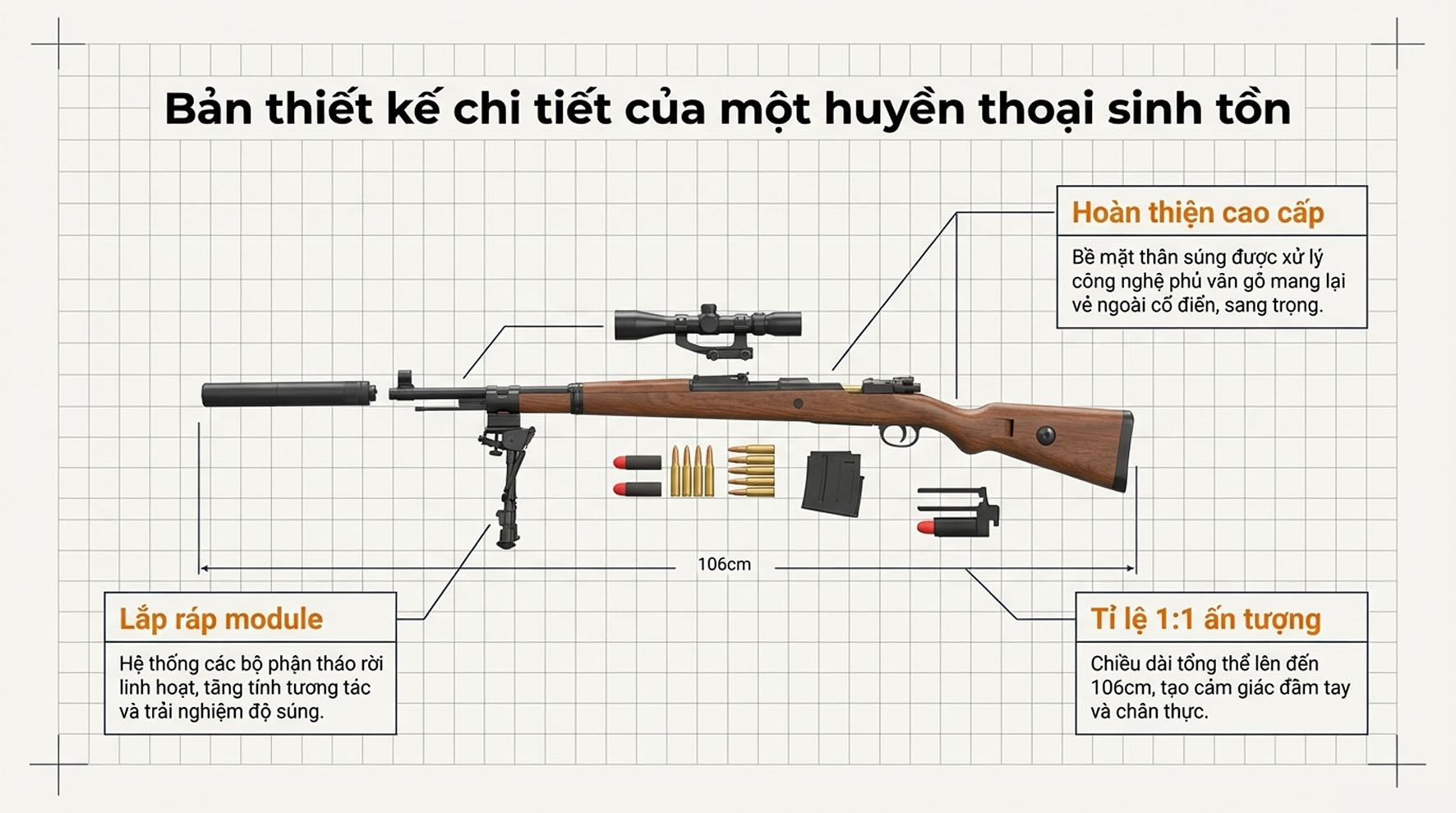 Súng đồ chơi Kar98K gây ấn tượng mạnh với vẻ ngoài được chăm chút kỹ lưỡng. Thân súng sở hữu lớp vỏ vân gỗ (wood grain) sang trọng, tạo cảm giác chuyên nghiệp và chân thực như một khẩu bắn tỉa thực thụ. Với chiều dài ấn tượng lên đến 103cm - 106cm, sản phẩm mang lại cảm giác cầm nắm chắc chắn và quyền uy