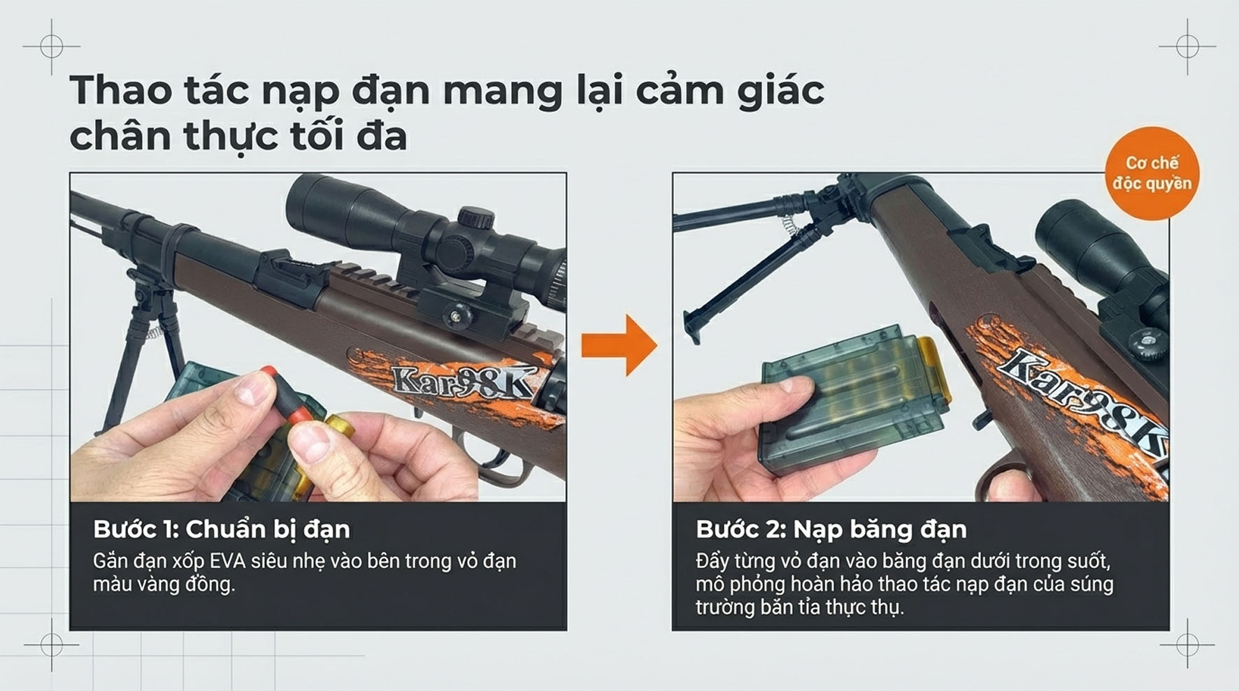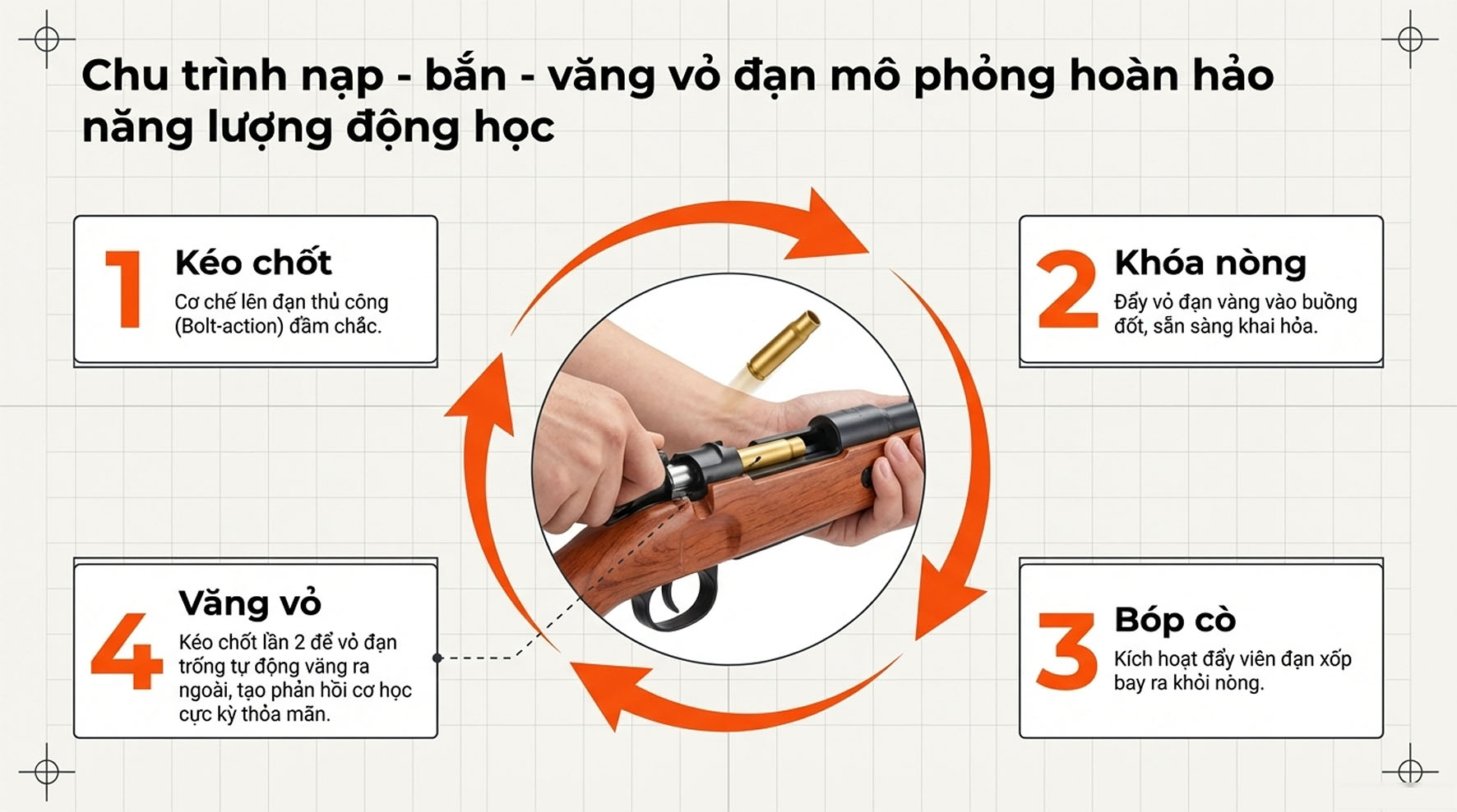 • Văng vỏ đạn: Sau khi bóp cò, vỏ đạn sẽ tự động văng ra ngoài, mô phỏng chính xác thao tác của một tay súng bắn tỉa