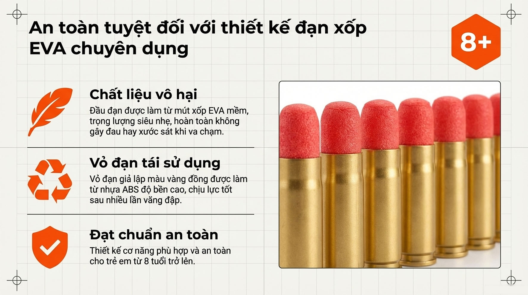 • Hệ thống đạn: Gồm 5 vỏ đạn vàng (Golden shells) và 20 viên đạn mềm EVA (Soft bombs) cực kỳ an toàn