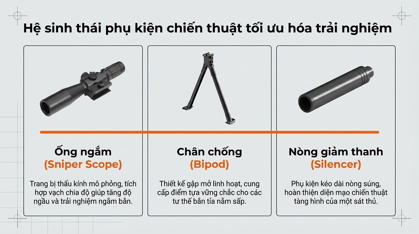 • Chân đế (Tripod): Hỗ trợ đặt súng cố định trên các địa hình phẳng để ngắm bắn chính xác hơn