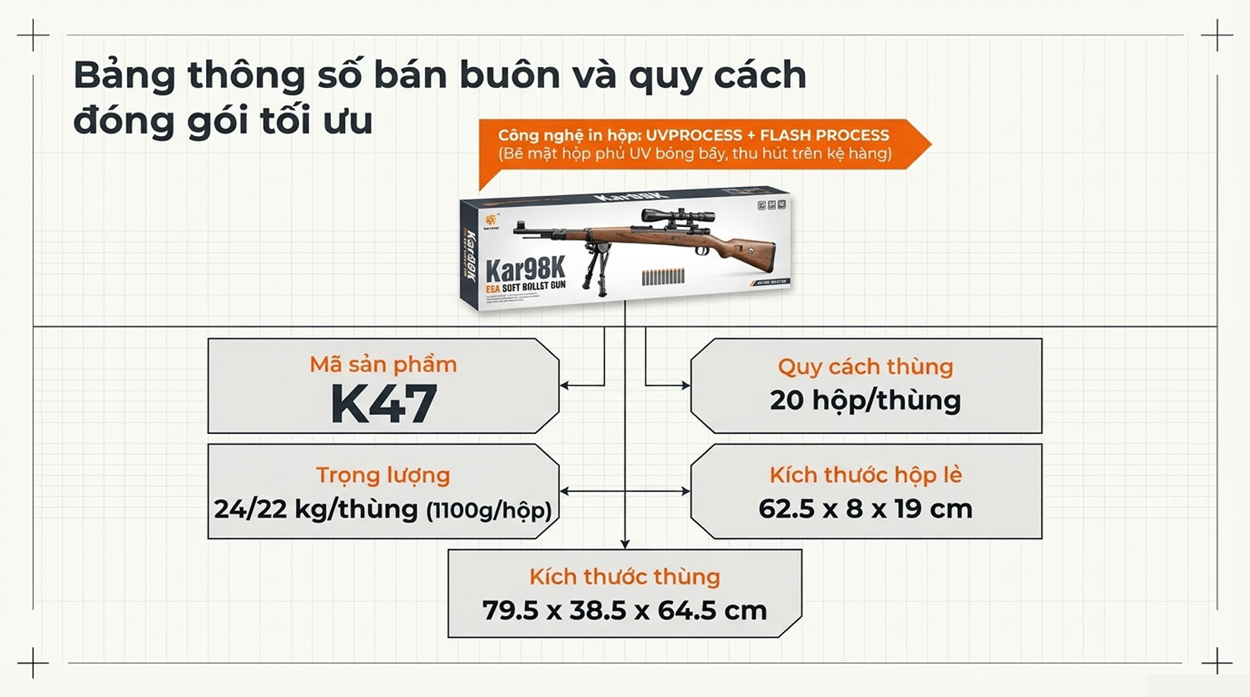 Sản phẩm được áp dụng quy trình sản xuất hiện đại UV Process + Flash Process, giúp màu sắc và các chi tiết trên súng bền bỉ, sắc nét