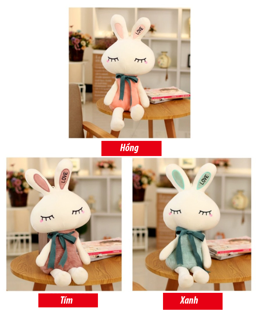 Dòng sản phẩm thỏ bông cao cấp có khá nhiều kích thước để khách hàng lựa chọn: 60 – 80 – 100 cm. Tuỳ theo sở thích mà bạn có thể lựa chọn cô nàng thỏ bông mắt híp với kích thước phù hợp